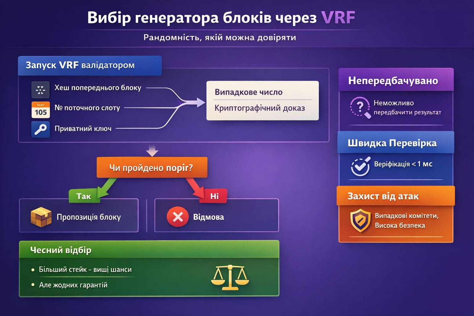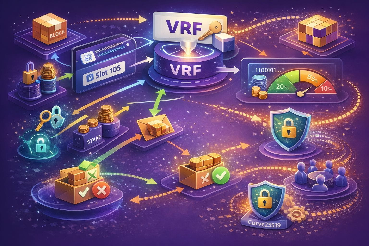 Критически важною является непредсказуемость этого процесса. Валидатор не знает наперед, будет ли он выбран, пока не выполнит вычисление, а сторонние наблюдатели не могут предсказать результат вообще. Это делает бессмысленными атаки с предварительным расчетом и попытки «перемолоть» входные данные в поисках выгодного результата. Дополнительно VRF используется для случайного формирования комитетов подтверждения, которые изменяются каждый слот, что существенно повышает стоимость атак и усложняет контроль над сетью даже для крупных игроков. Неинтерактивная природа VRF снижает сетевые затраты, а проверка доказательств занимает доли миллисекунды, позволяя быстро подтверждать легитимность генератора блока.