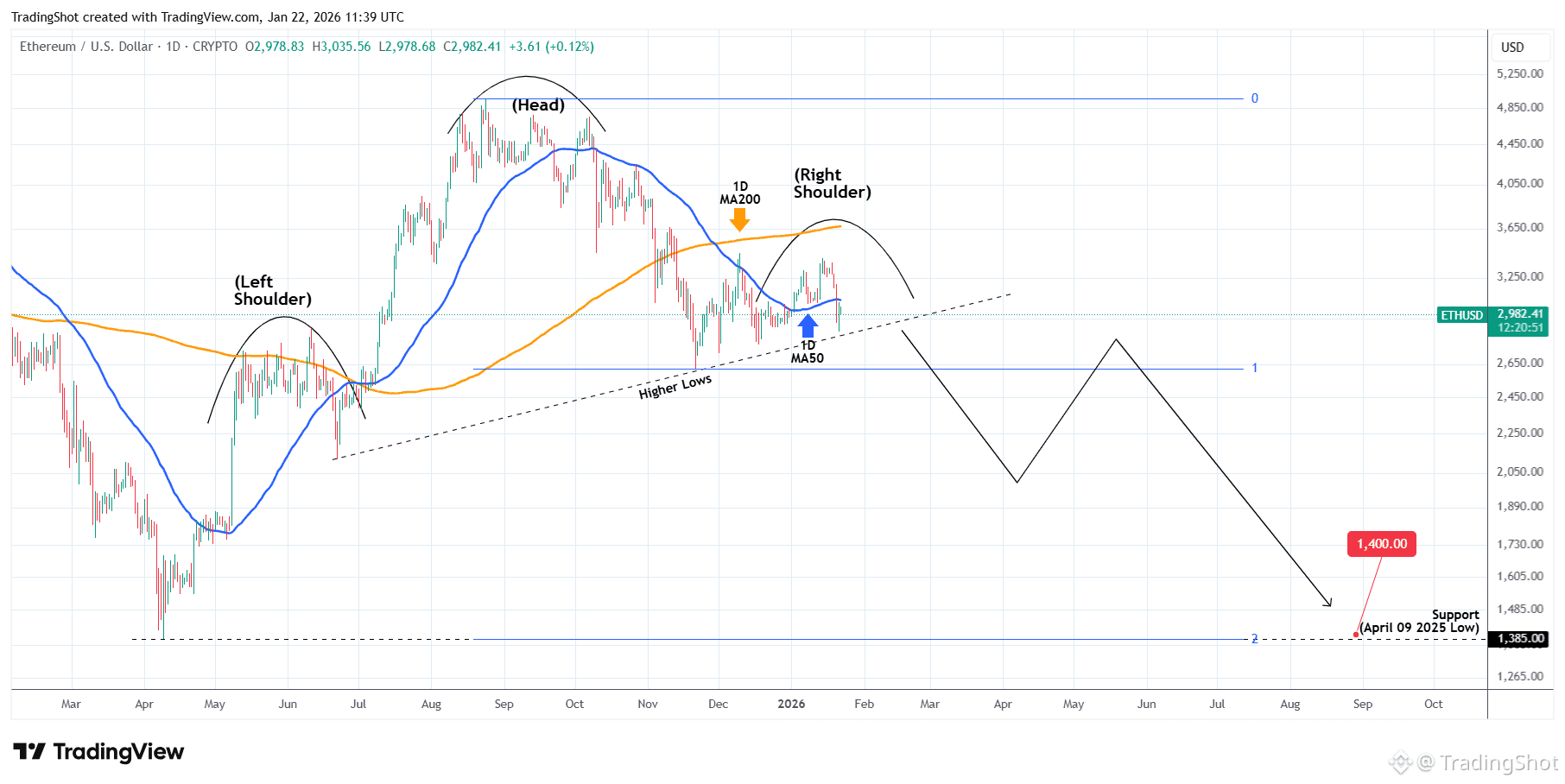 На дневном графике ETHUSD ценовое движение методично вырезало классическую формацию Голова и Плечи (H&S), одну из самых исторически надежных макро-медвежьих разворотных структур в техническом анализе.