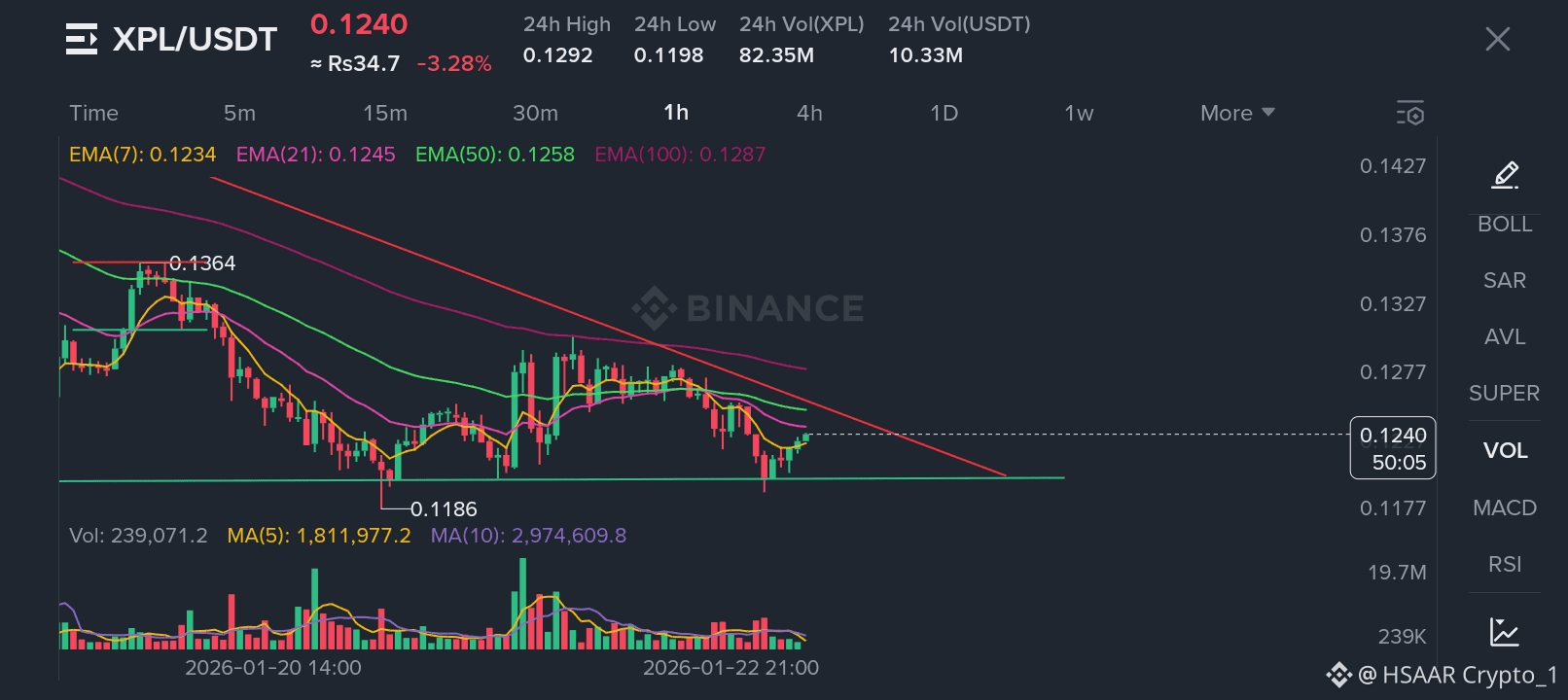 This chart for XPL/USDT, likely on a 5-minute to 1-hour timeframe, shows that the price is currently at 0.1240, having decreased by 3.28% over the last 24 hours. The 24-hour high was 0.1292 and the low was 0.1198. The trading volume for XPL in the past 24 hours was 82.35M. 📉