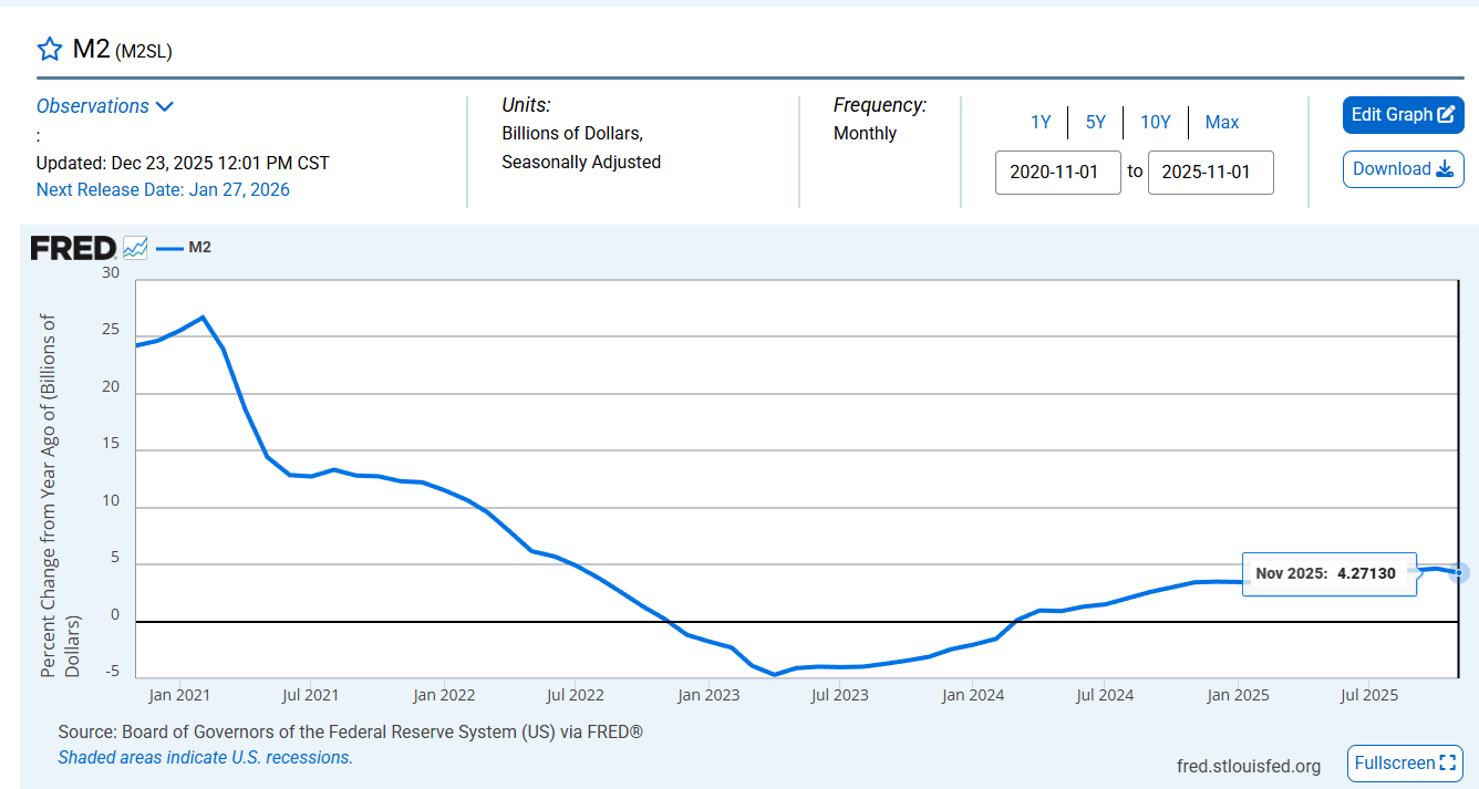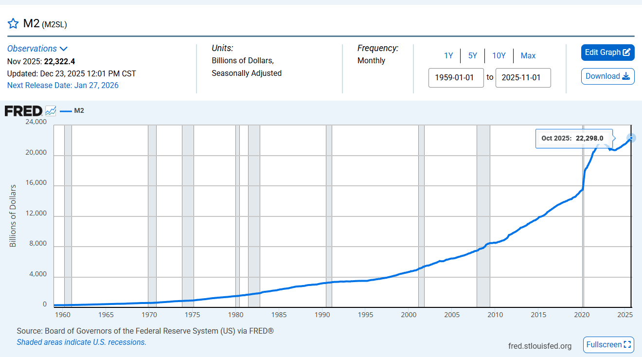 Общий объем денежной массы M2 и темпы роста в годовом исчислении: на основе данных серии "M2SL", опубликованных на официальном сайте Федеральной резервной системы (FRED) по состоянию на ноябрь 2025 года. Задержка публикации составляет приблизительно 1-2 месяца.