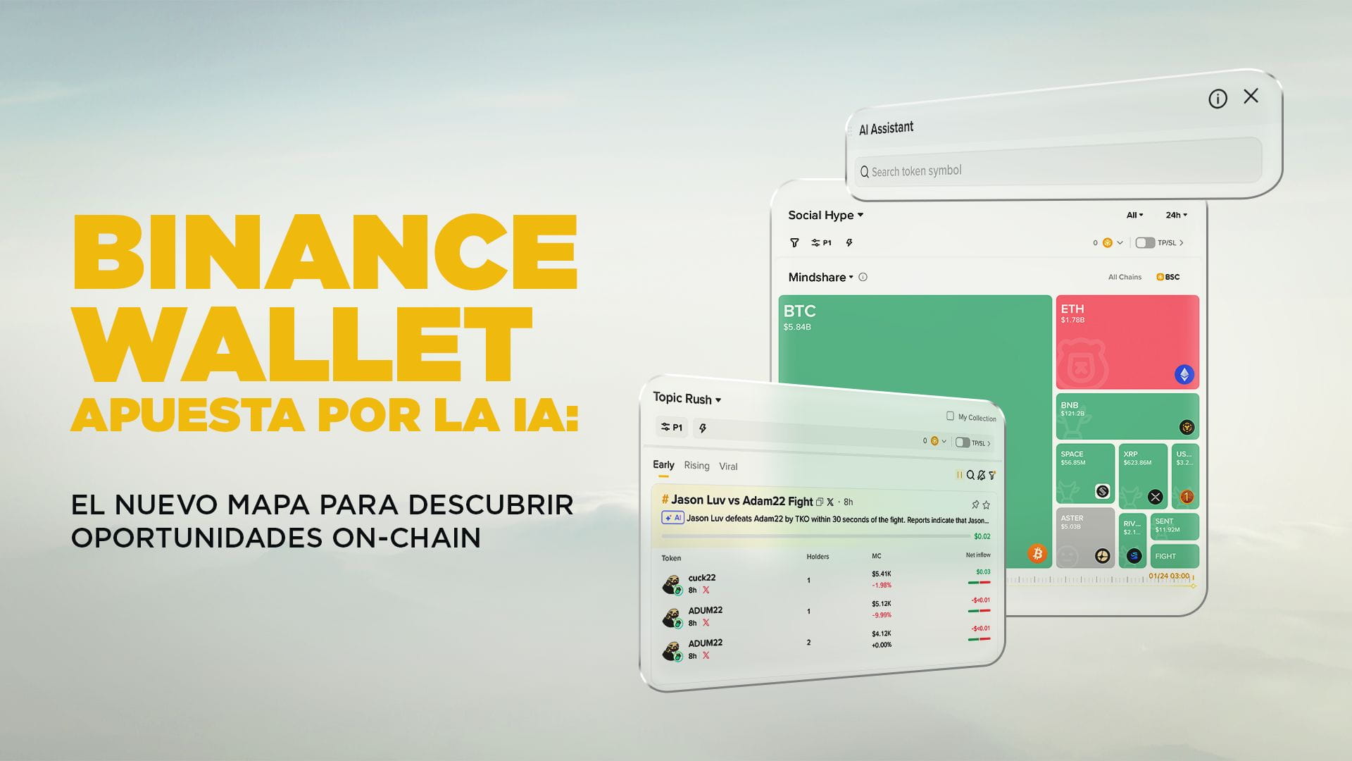 Con la incorporación de nuevas funciones de inteligencia artificial en Binance Wallet —Social Hype, Topic Rush y AI Assistant—, Binance propone un cambio de enfoque: pasar de una exploración reactiva a un descubrimiento on-chain asistido por IA, más rápido, contextual y accionable.