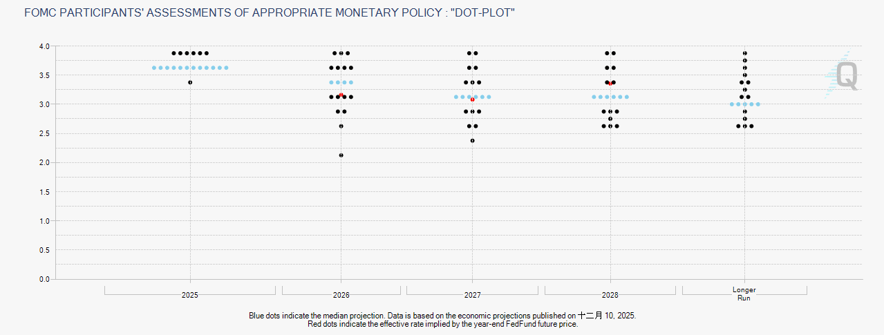● Однако под этой кажущейся спокойствием рынок незаметно корректирует ожидания по снижению ставок Федеральной резервной системы. Ранее рынок ожидал, что в 2026 году может быть два-три снижения ставок, но теперь эти ожидания сближаются с "только одним снижением ставки в 2026 году", как это показано в точечном графике Федеральной резервной системы.