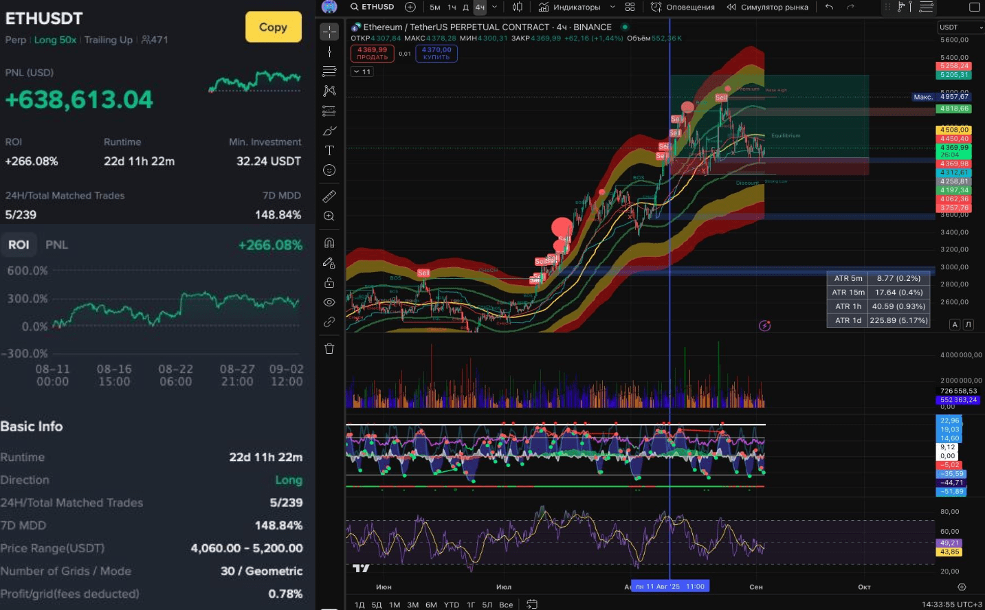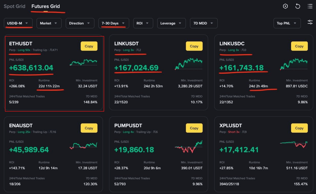 Фьючерсные боты удивили доходностью лидера - лонгового бота с 50 плечом по ETH/USDT с PNL + $638613 и ROI + 266,08% за 22 дня