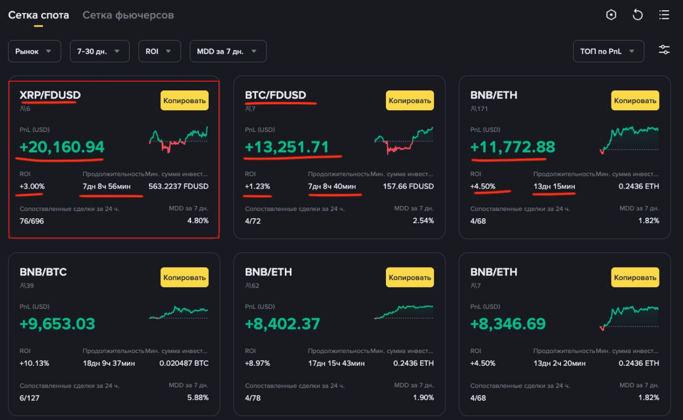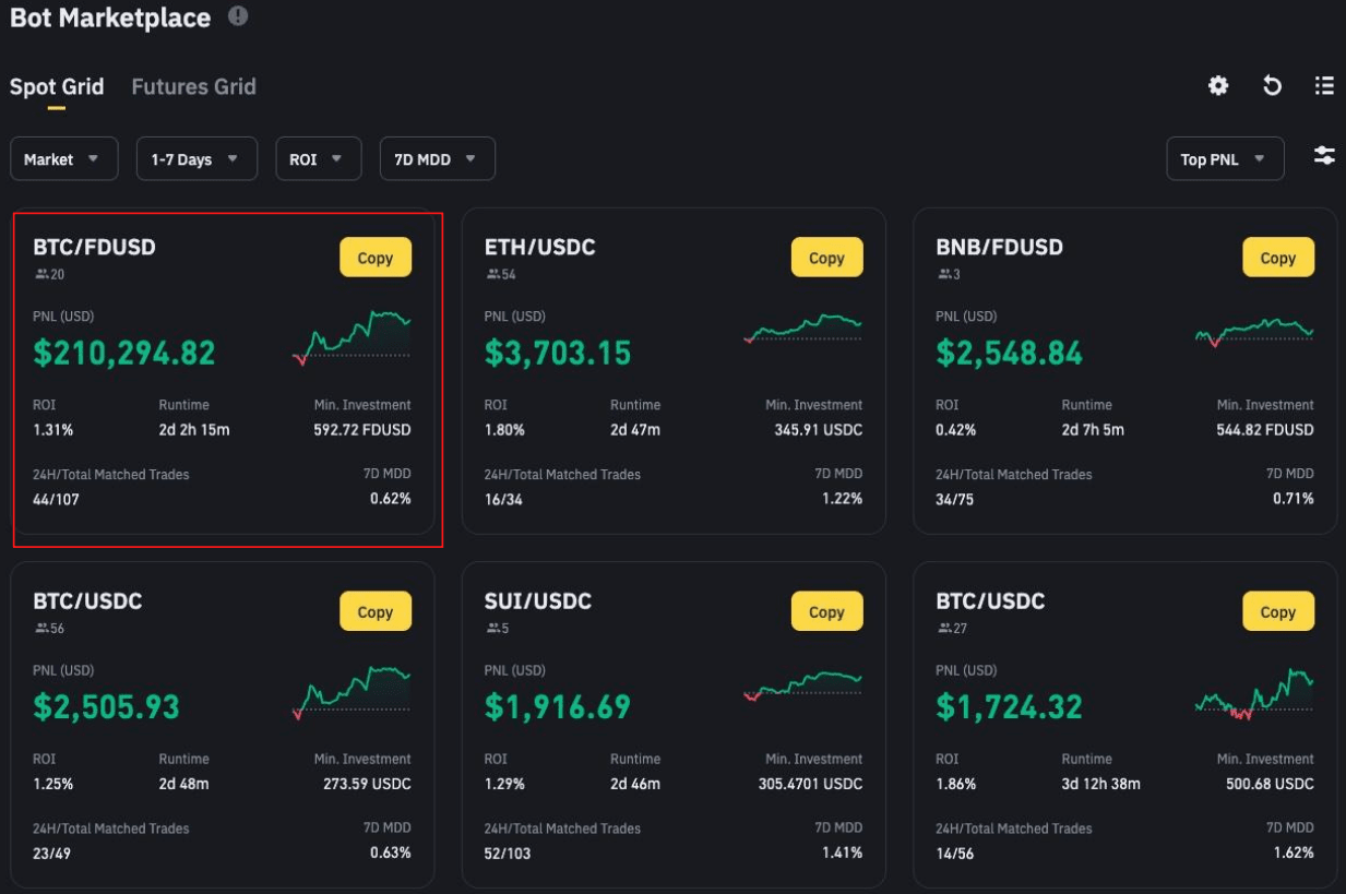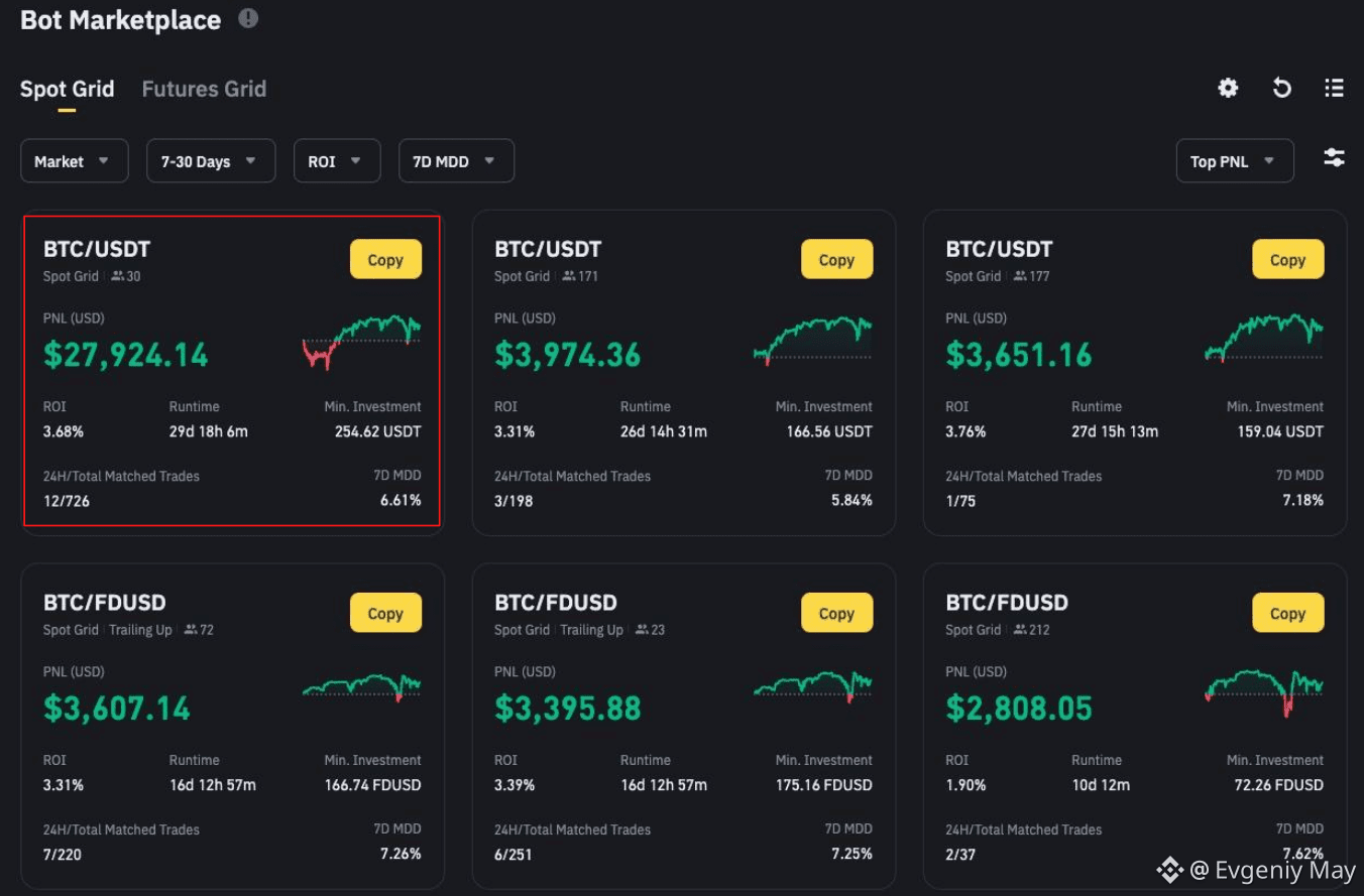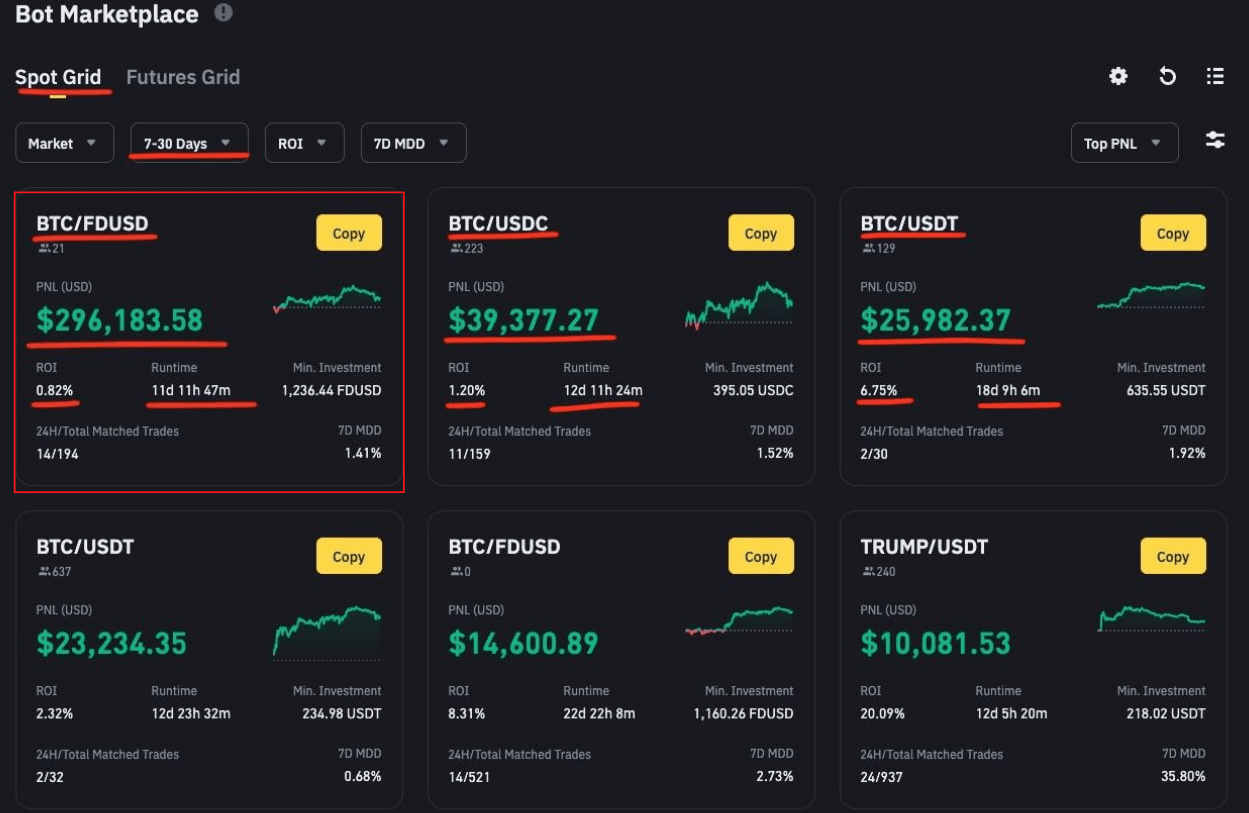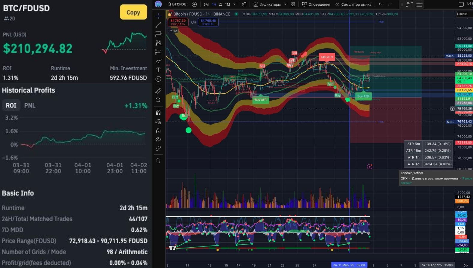 В марте 2025 года отличился Spot Grid бот на паре BTC/FDUSD c PNL + $210294 и ROI +1.31% за два дня