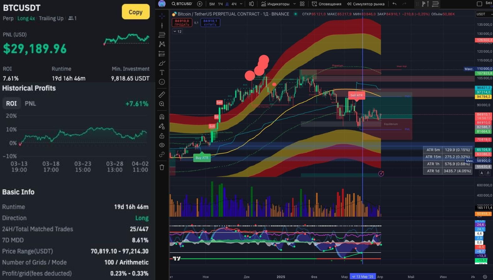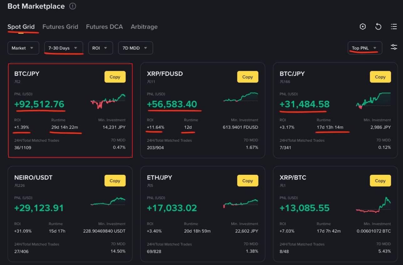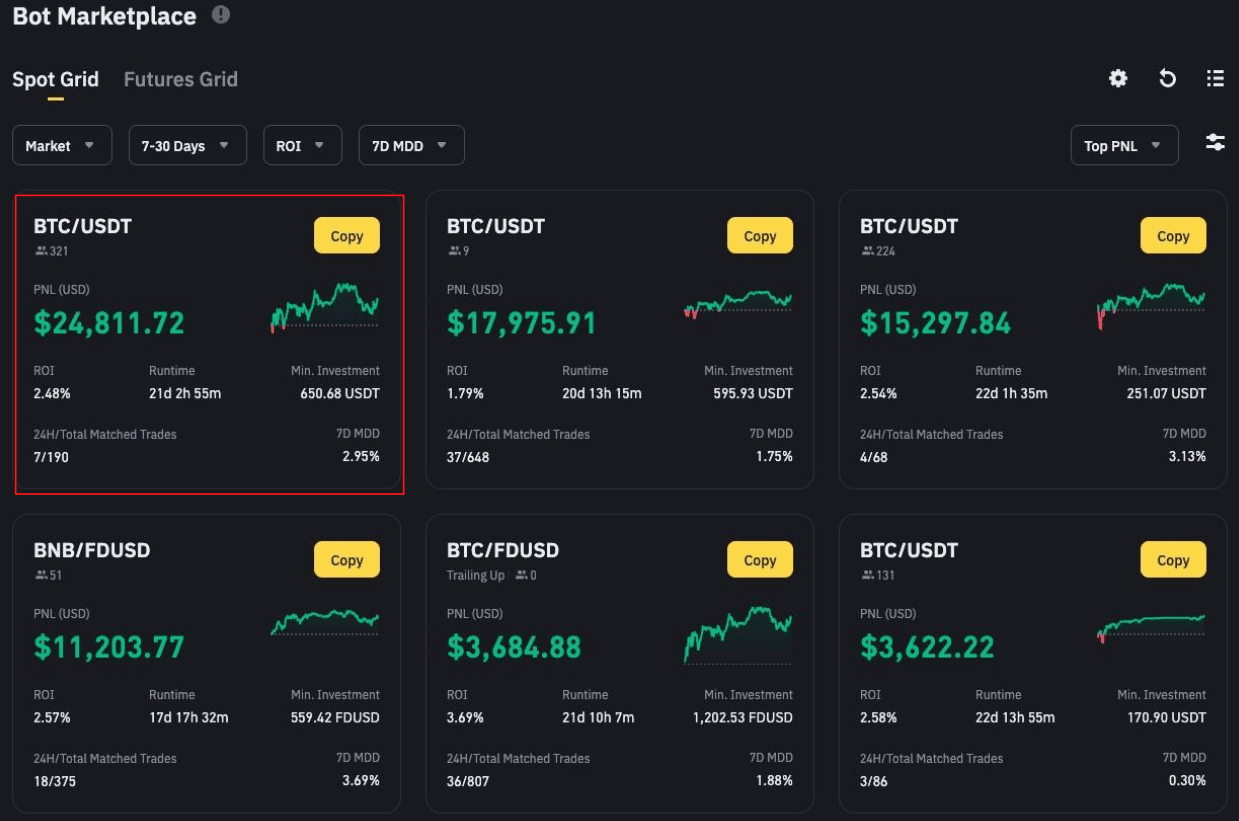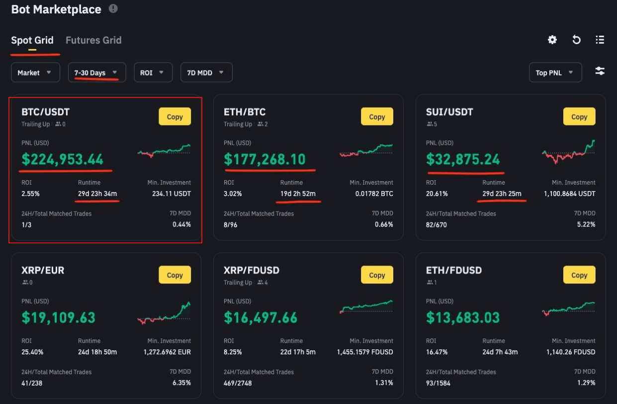 В марте 2025 года отличился Spot Grid бот на паре BTC/FDUSD c PNL + $210294 и ROI +1.31% за два дня