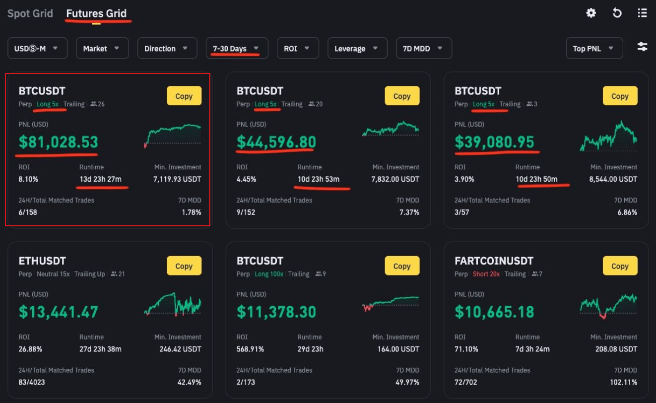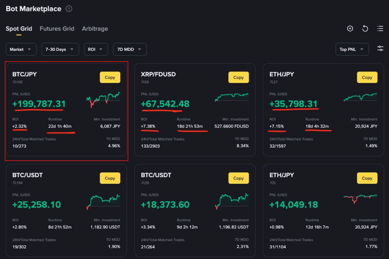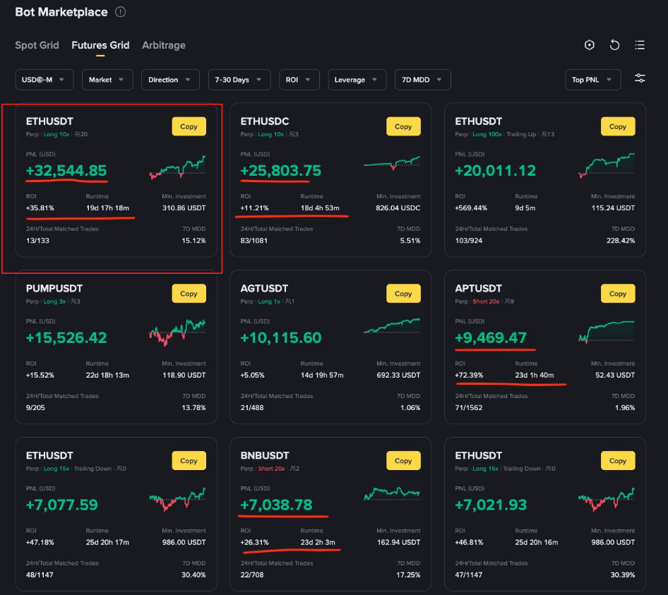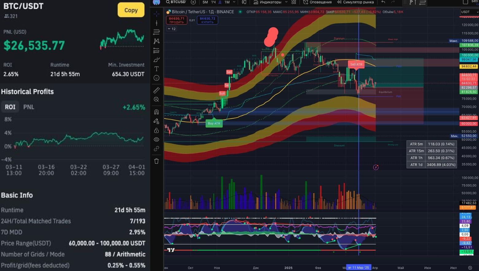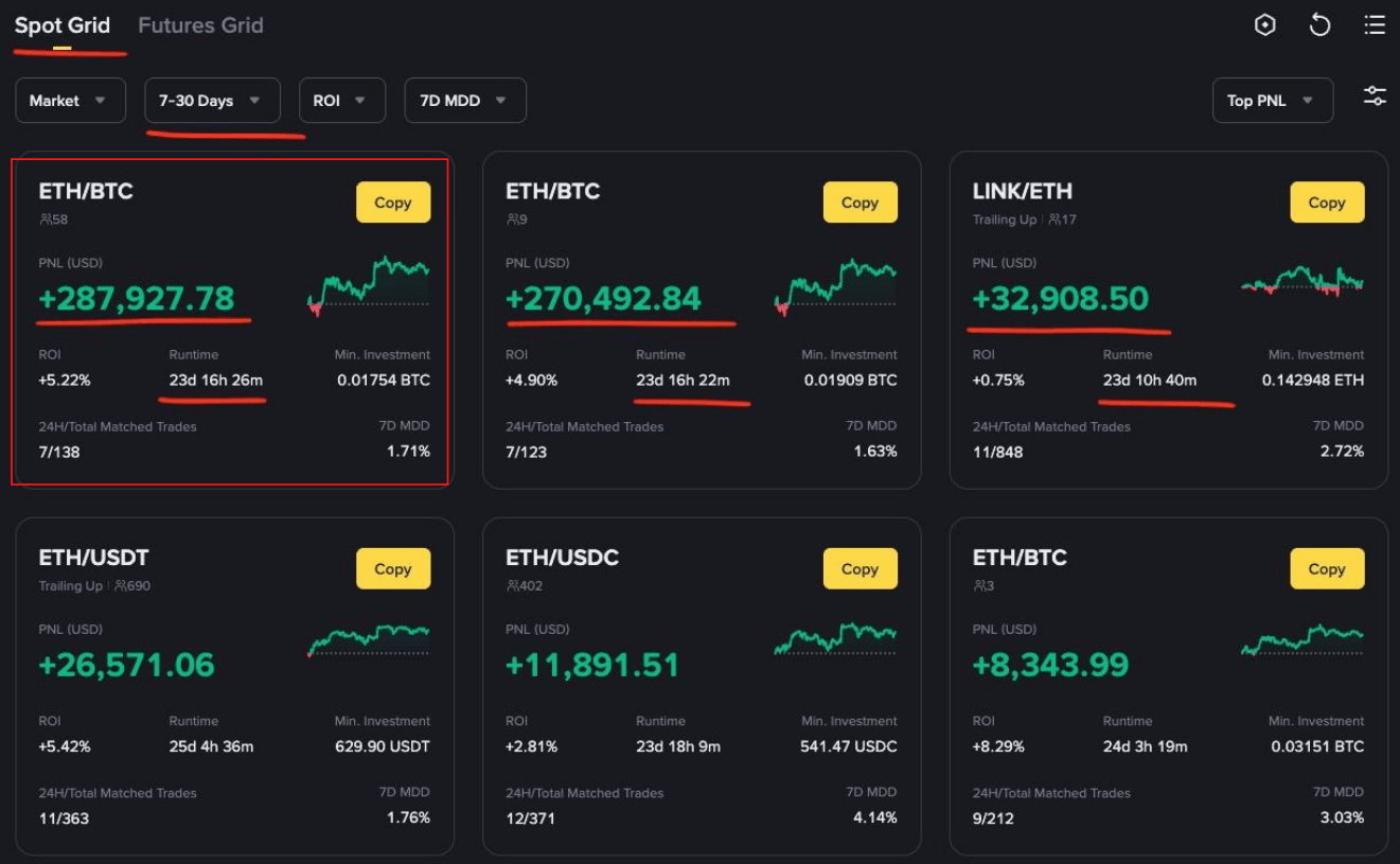 В марте 2025 года отличился Spot Grid бот на паре BTC/FDUSD c PNL + $210294 и ROI +1.31% за два дня