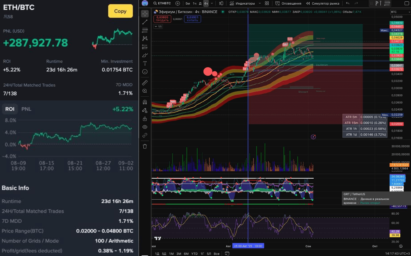 В августе лучший результат показал Spot Grid бот ETH/BTC с PNL +$287927 и ROI + 5,22% за 23 дня