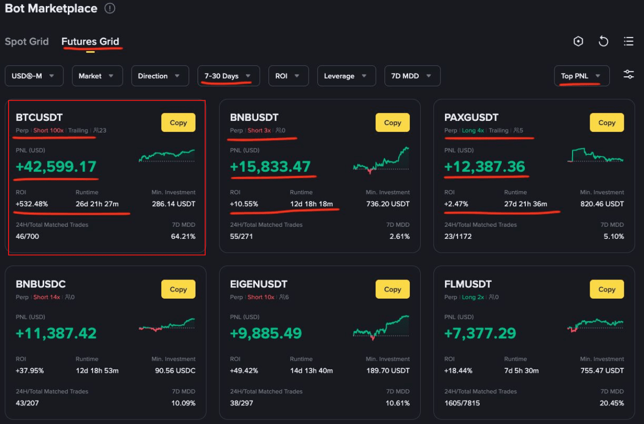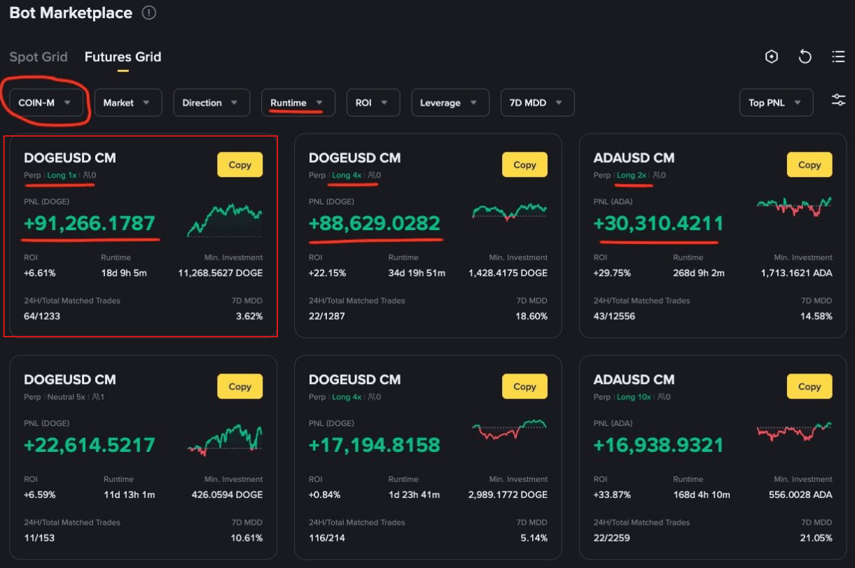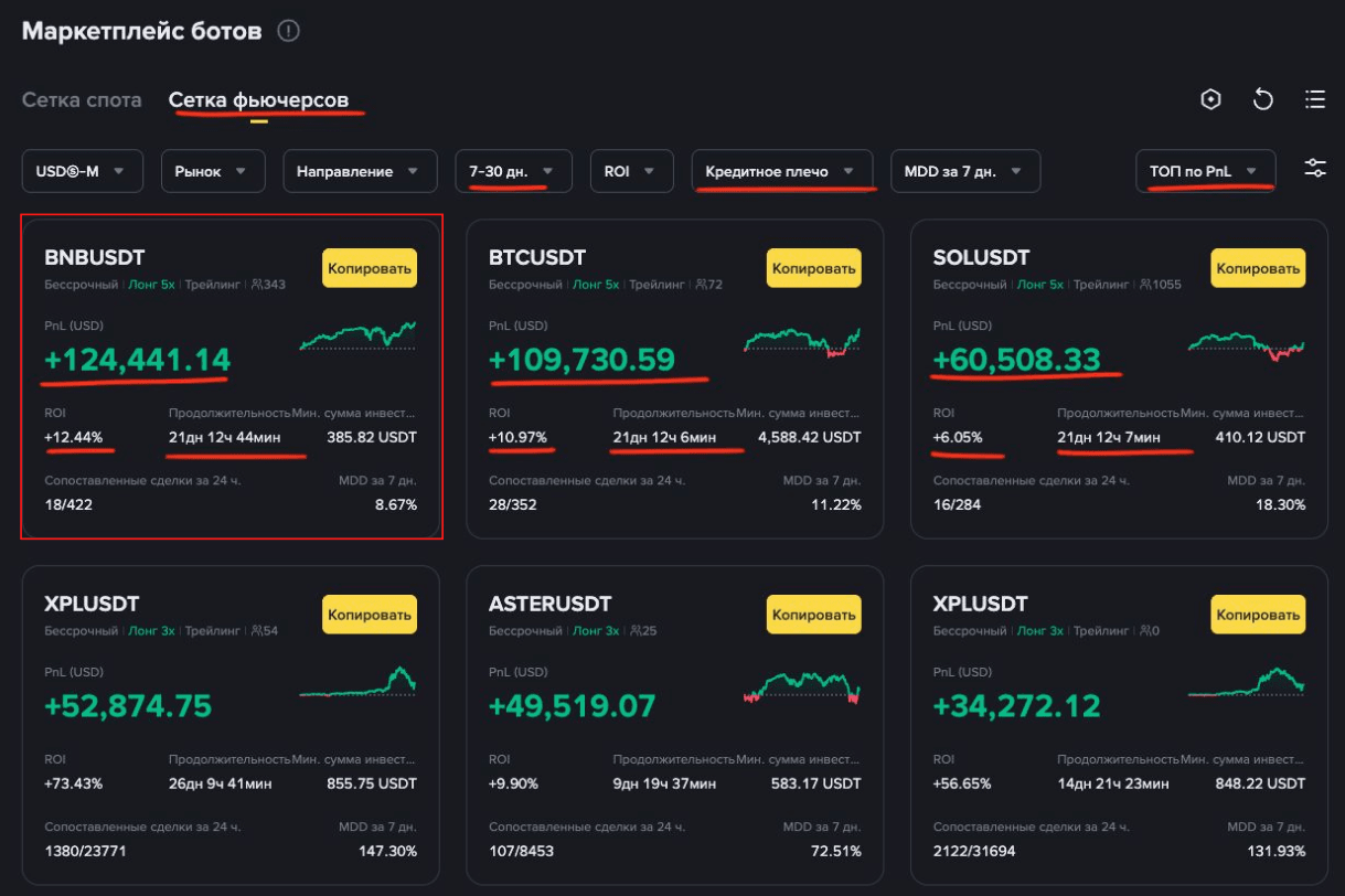 В декабре на маркетплейсе появились результаты ботов Futures DCA и теперь вы можете посмотреть настройки не только гридов, но и DCA, это очень хорошо ))