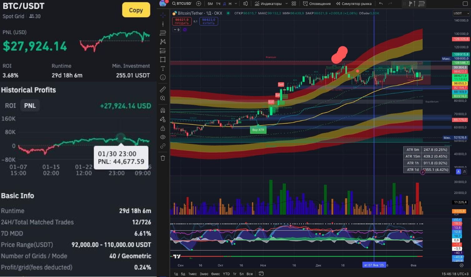 За 29 дней бот заработал на споте 3,68%, что составило $27924, максимальное проседание за 7 дней было 6,61%, диапазон торговли от 92000 до 110000, с 40 ордерами и с доходностью на сделку 0,24% (исключая комиссию)