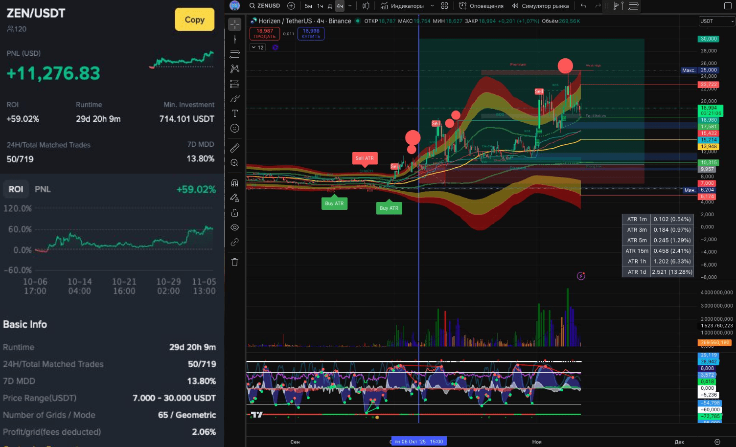 В лидерах оказался Spot Grid бот по ZEN/USDT с PNL +$11276 и ROI 59% за 29 дней