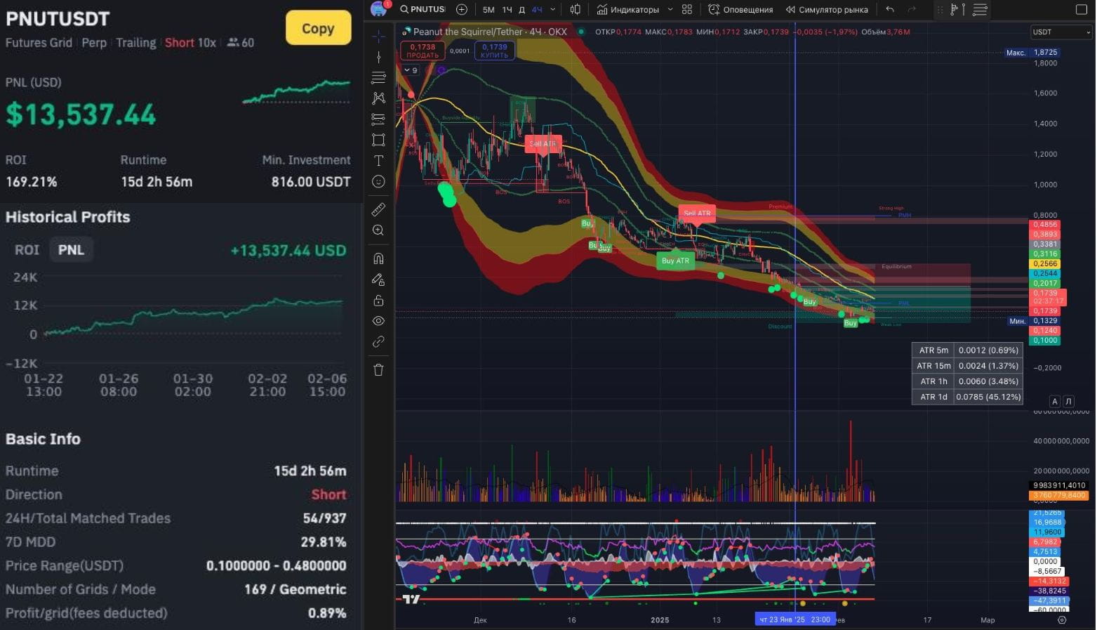 Волатильность PNUT на тот момент за 5 минут составляла 0,69%, а за 15 минут 1,37%