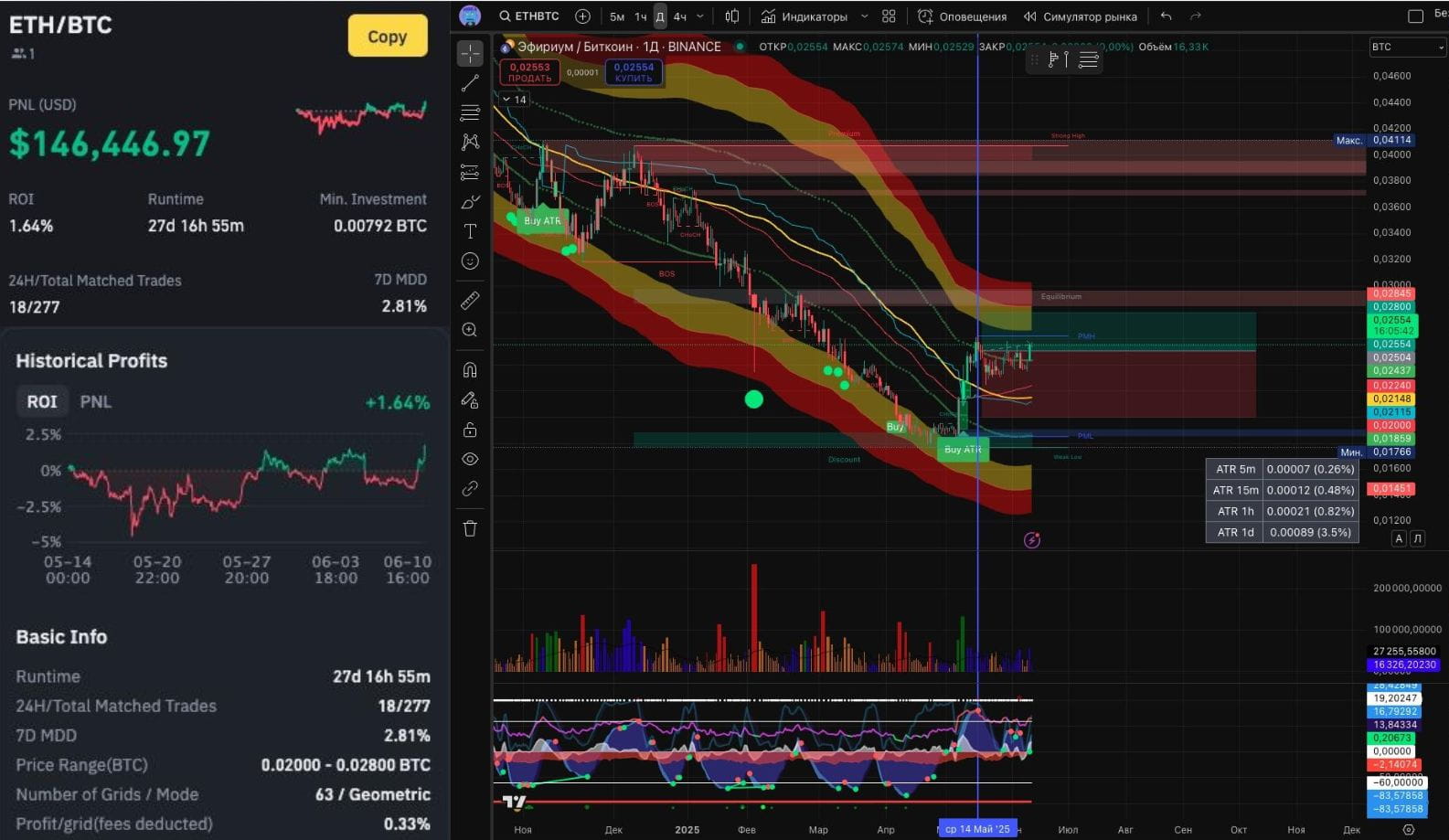 В мае 2025 года в лидеры вышел ETH/BTC Spot Grid с PNL + $146446 и ROI + 1,64% за 27 дней