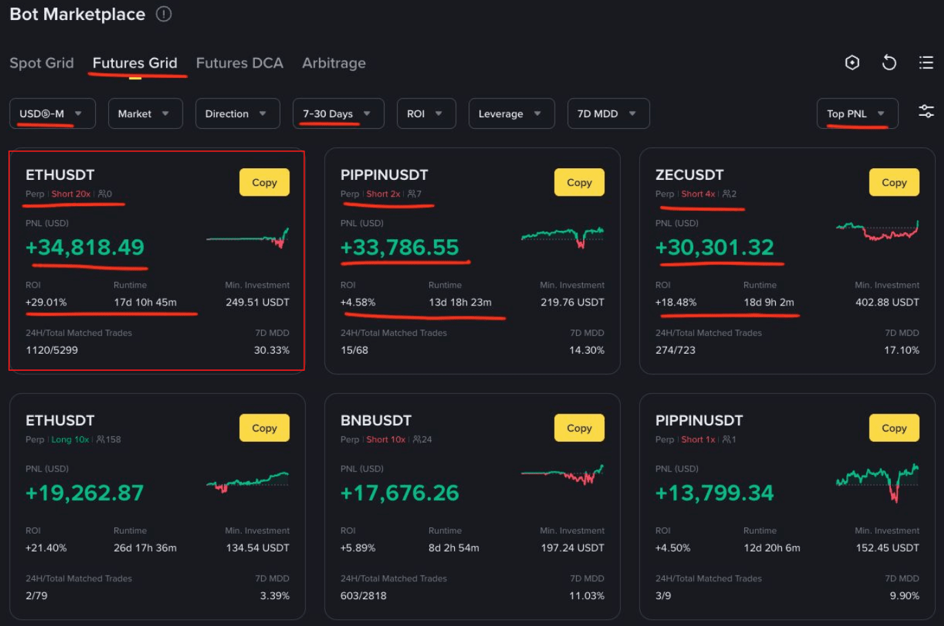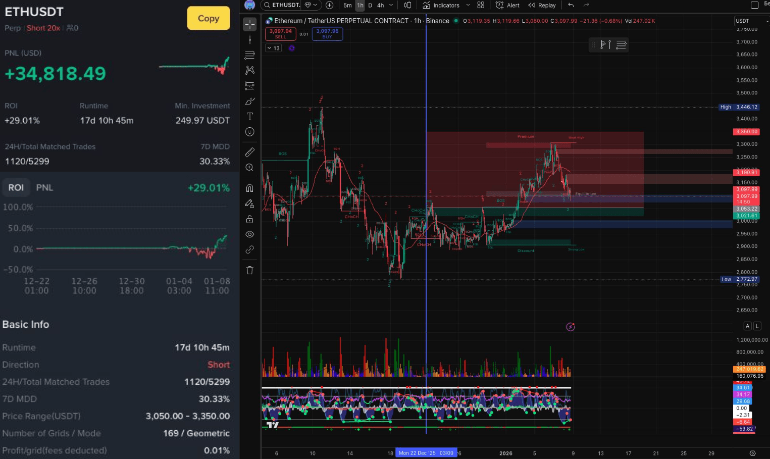 В гридах на фьючерсах в декабре в лидерах оказался шортовый бот с 20 плечом по ETH/USDT c PNL + $34818 и ROI +29% за 17 дней
