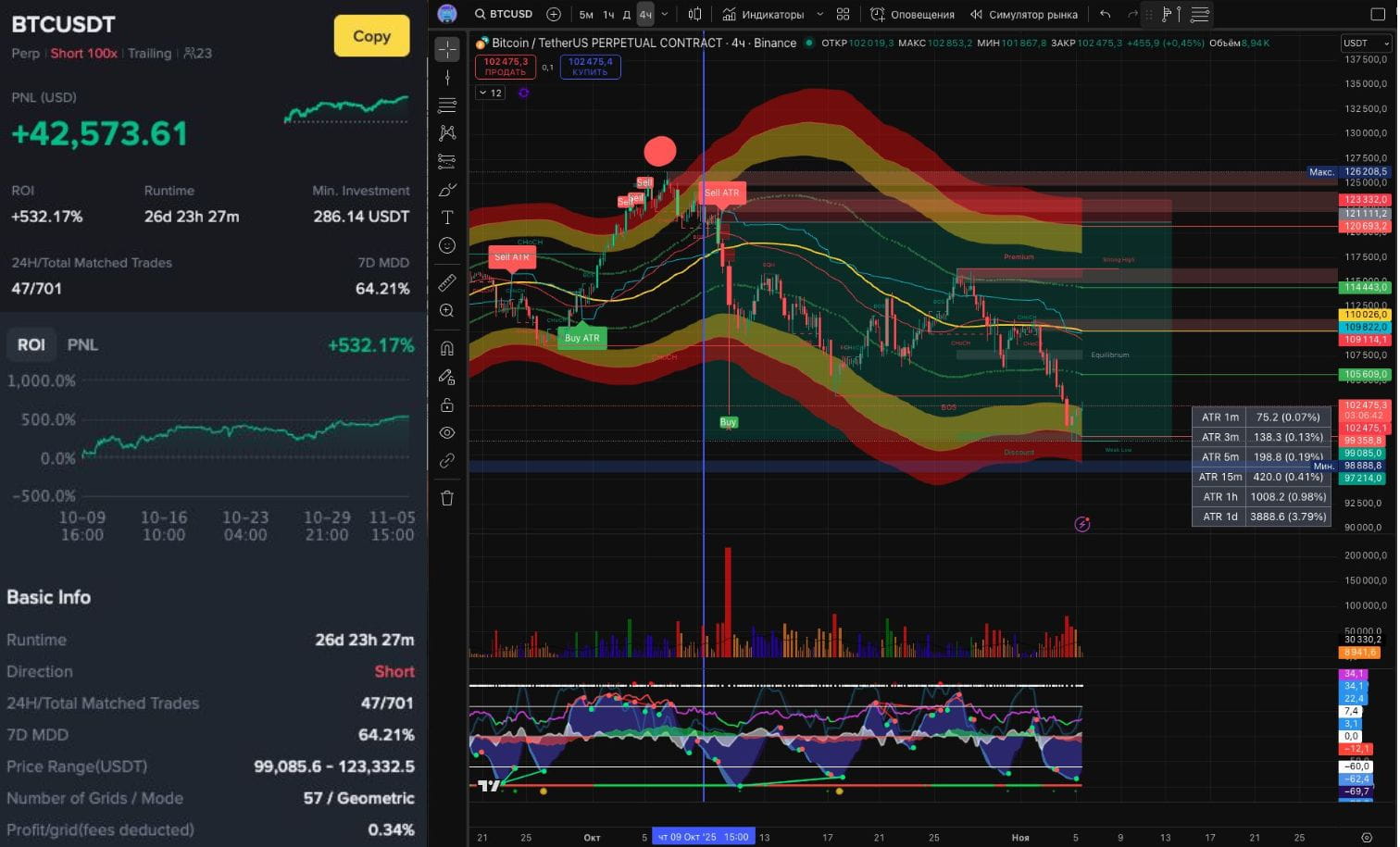 На фьючерсах в октябре в лидеры вышел шортовый бот с трейлингом и 100 плечом BTC/USDT с PNL +$42599 и ROI 532% за 26 дней