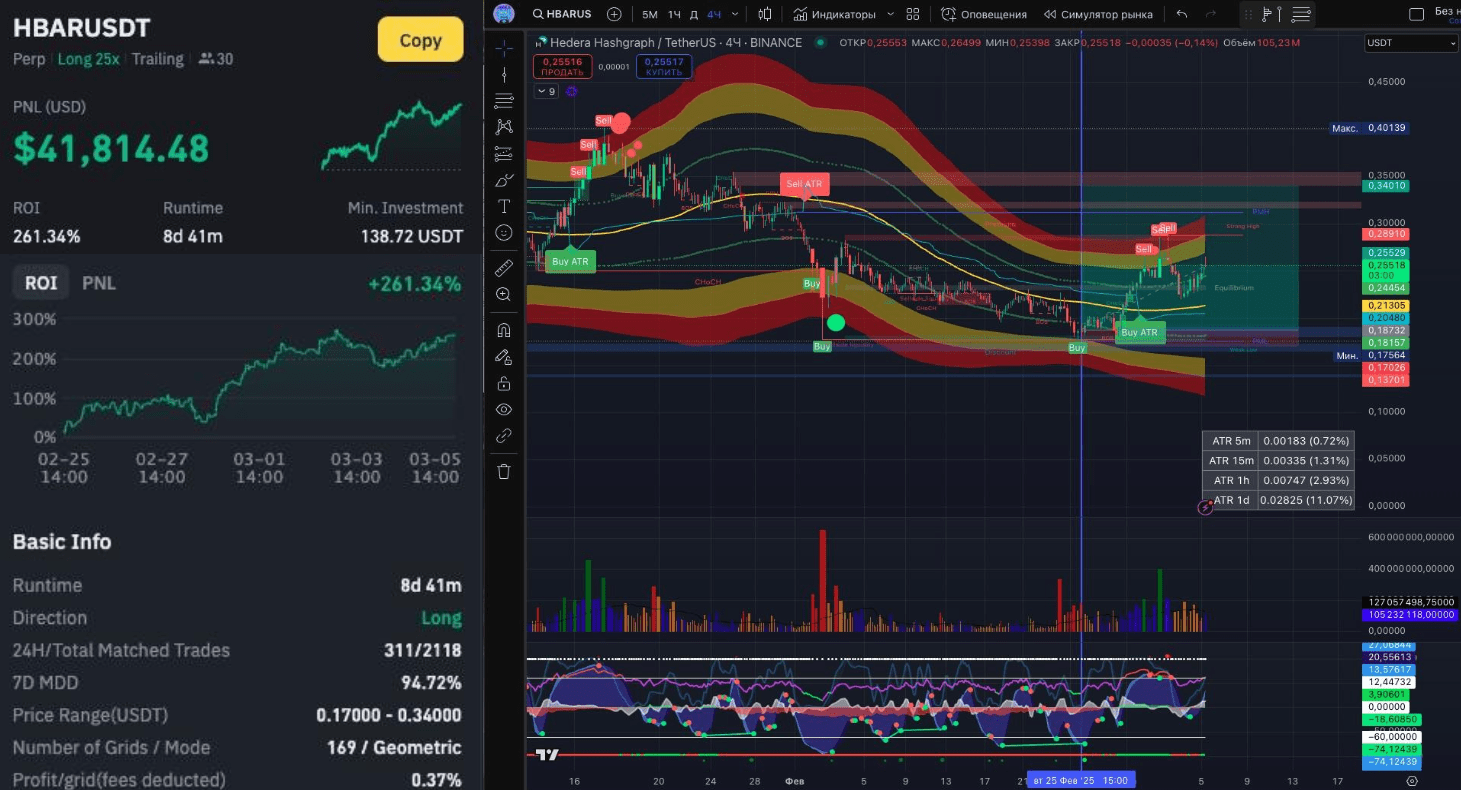 Во фьючерсных ботах в феврале 2025 года отличился HBAR/USDT c PNL +$41276 и ROI + 257%