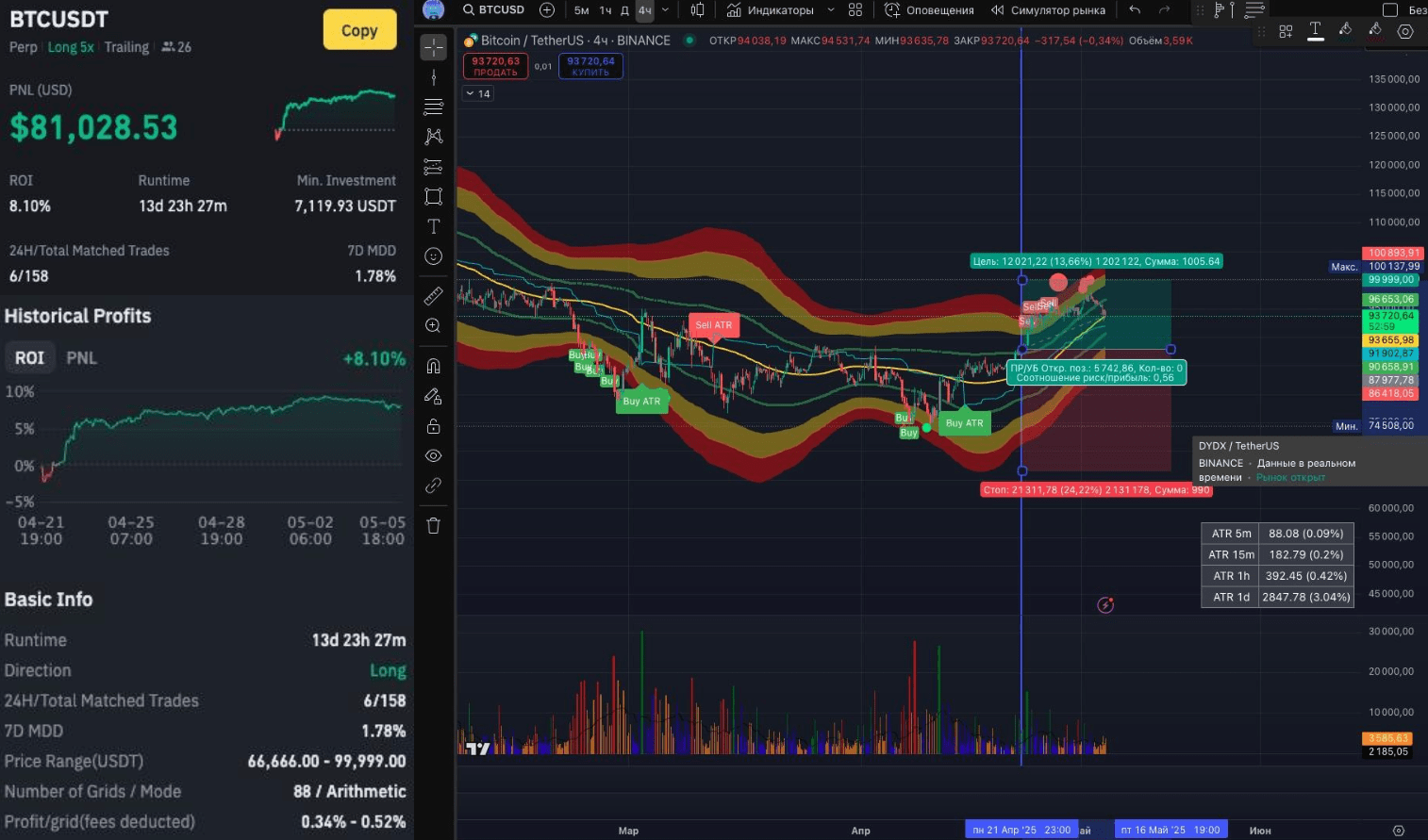 Диапазон $60000 - $100000 с 88 сетками и прибыль/ордер 0,25%-0,55%