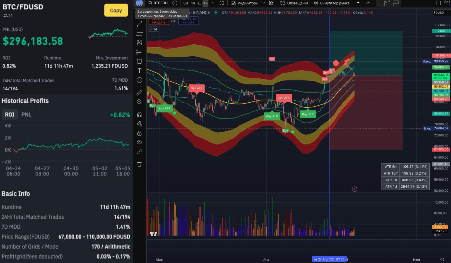 Апрель 2025 года порадовал доходностью Spot Grid бота BTC/FDUSD с PNL + $296183 и ROI +0,82% за 11 дней ))