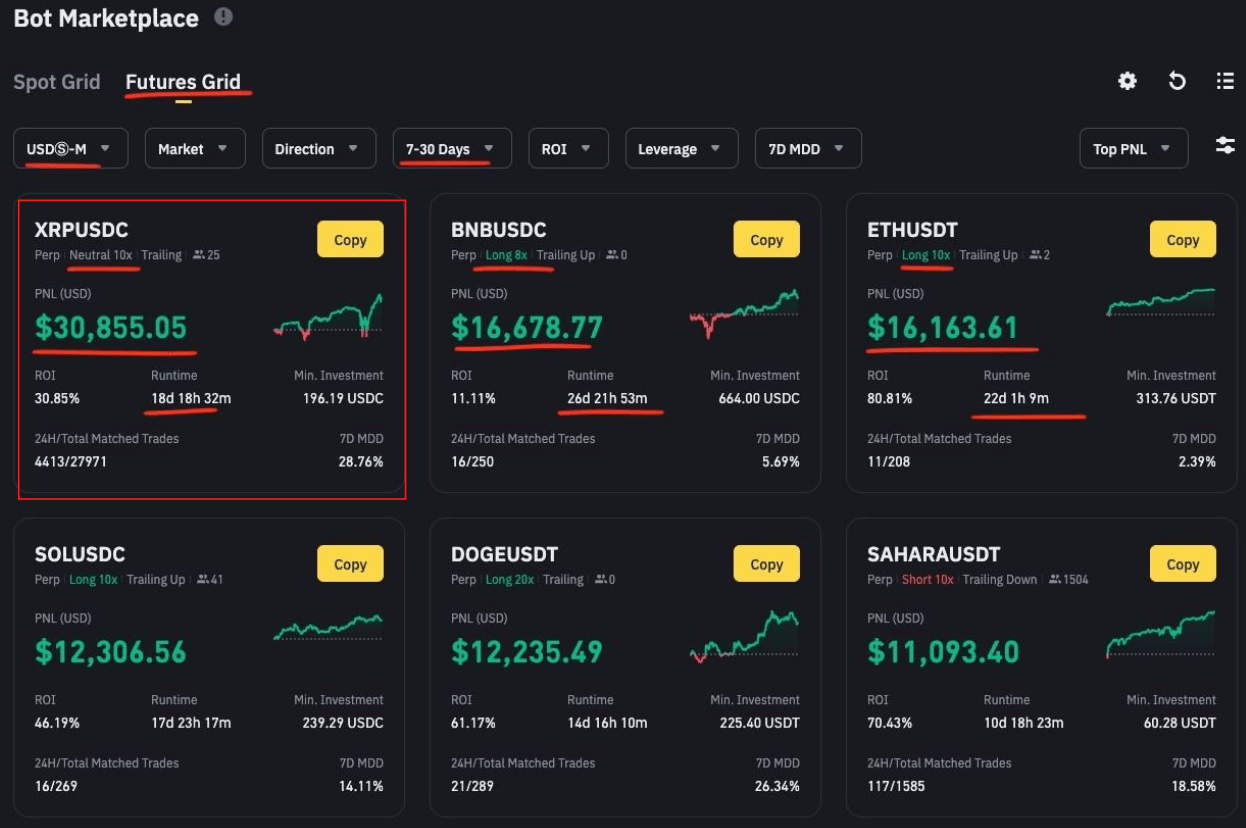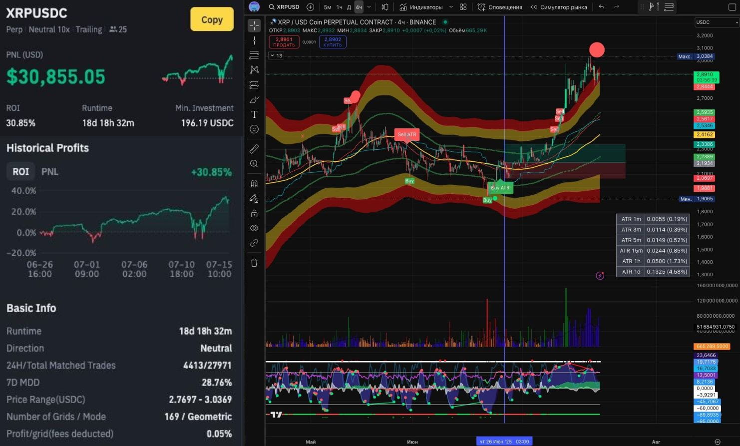 На фьючерсах в июне в лидерах оказался нейтральный грид бот XRP/USDC (в парах с USDC убрали комиссию мейкера) с PNL +$30855 и ROI 30,85%, с трейлингом и 10 плечом за 18 дней.