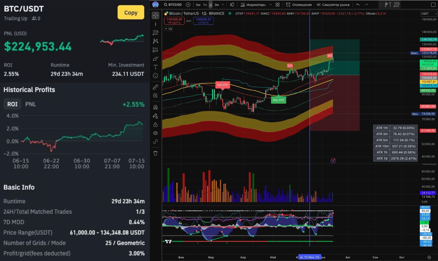 Июнь удивил спотовым Grid Bot на BTC/USDT c PNL + $224953 и ROI + 2,55 % (да, киты снова заплыли в спотовый грид на биткоин)) за 29 дней