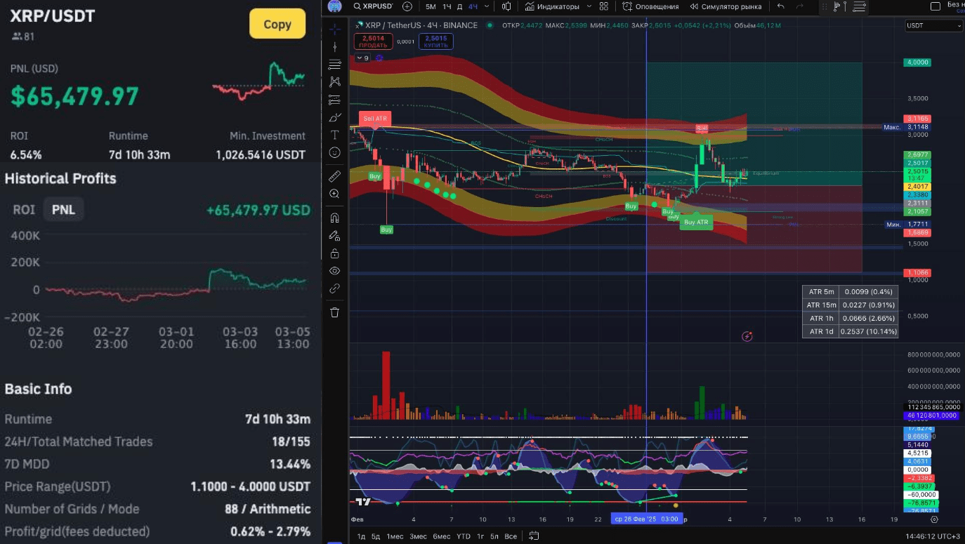 В феврале 2025 года на 1 месте по доходности на Spot Grid оказался $XRP с PNL + $65479 за 7 дней и ROI +6,54%