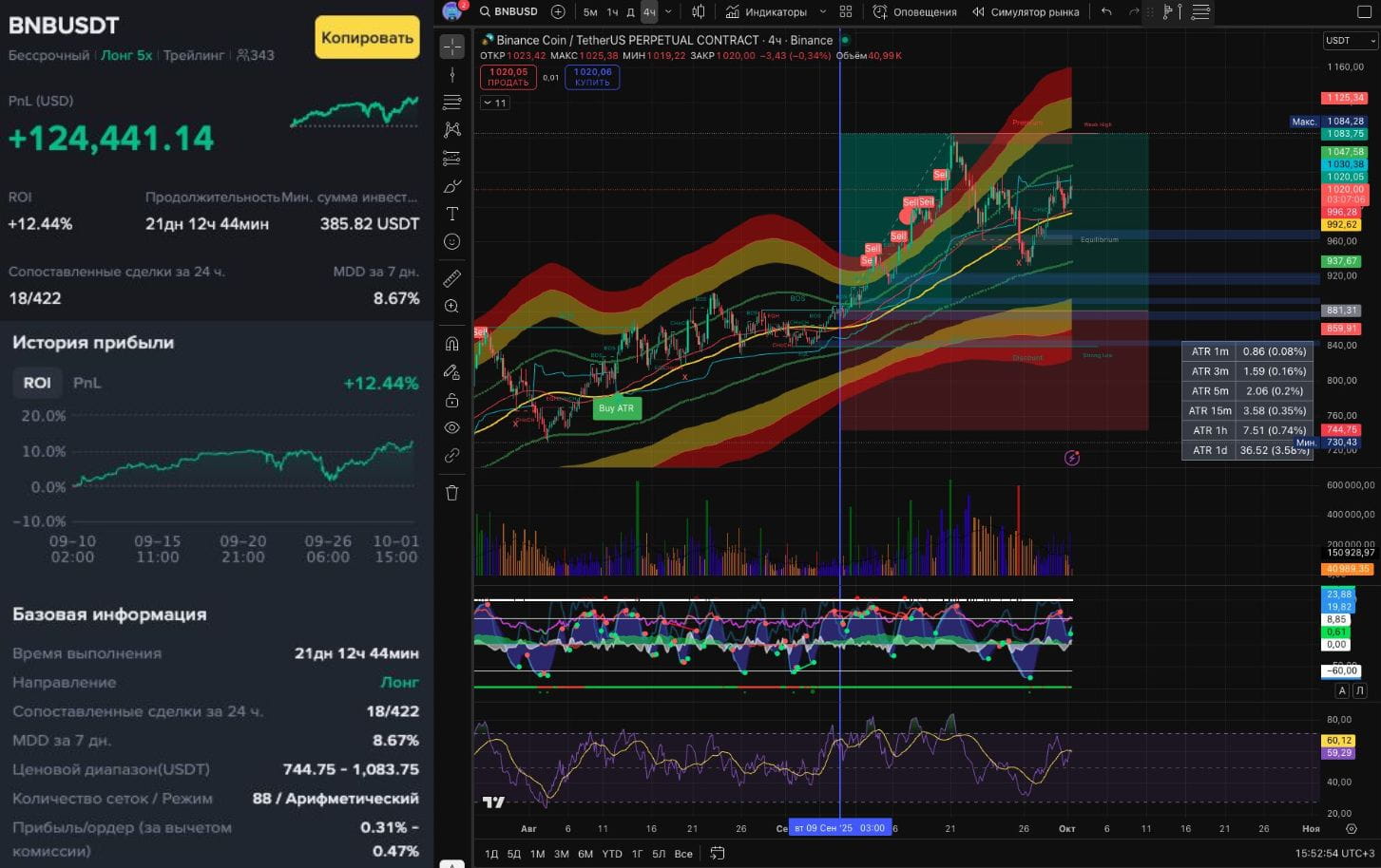 На фьючерсах в сентябре в лидерах оказался лонговый бот с трейлингом и 5 плечом BNB/USDT с PNL + $124441 и ROI + 12,24%