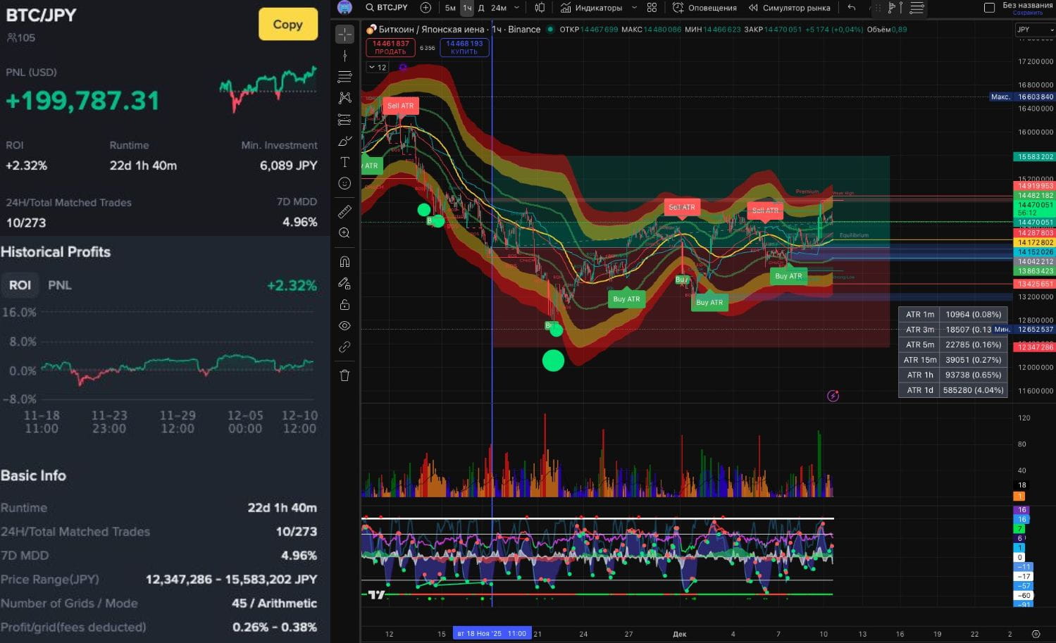 Ноябрь удивил появлением пары BTC/JPY в лидерах с PNL + $199787 и ROI + 2,32 % за 22 дня (снова киты заплыли в спот грид ботов))