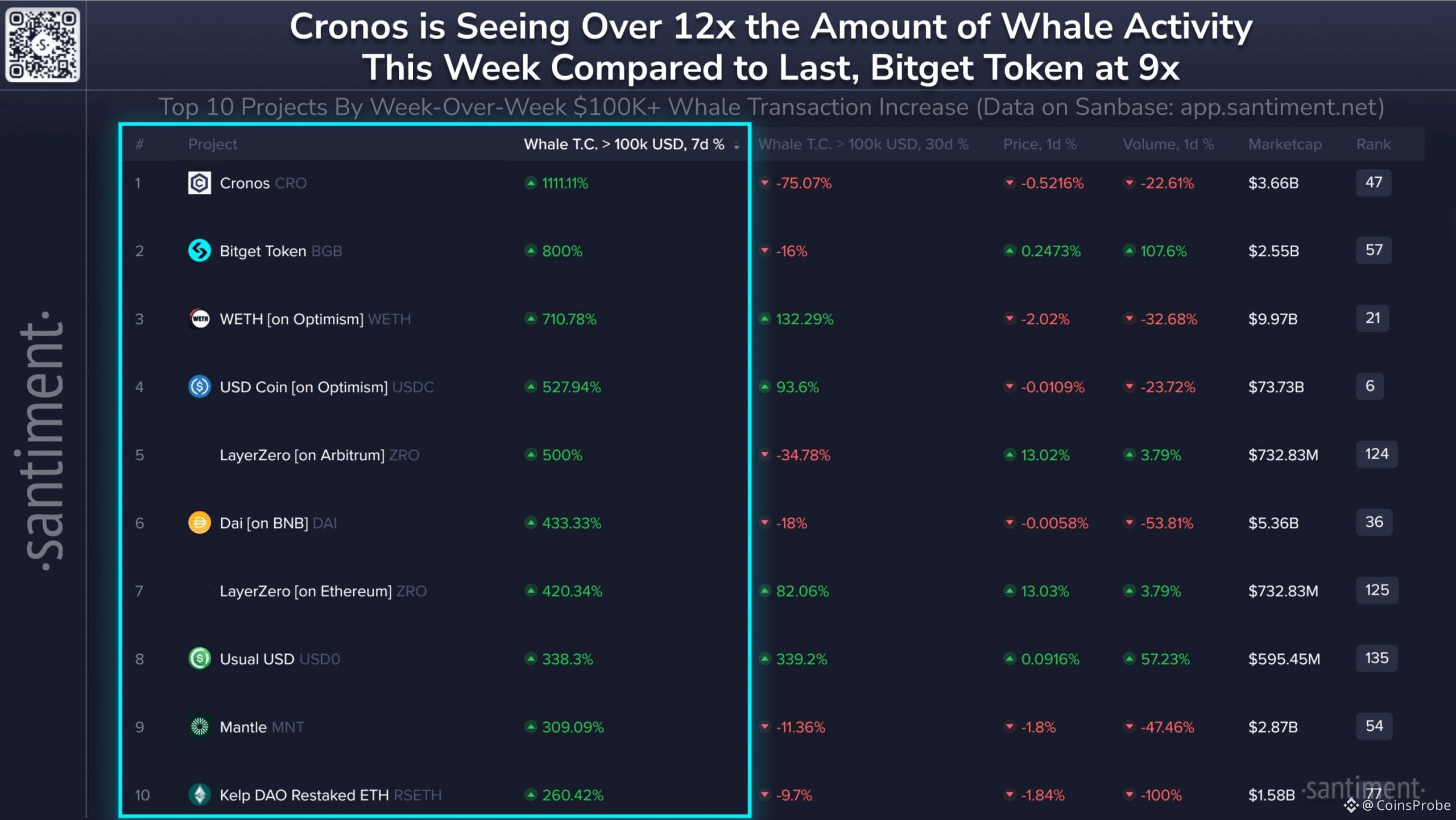 According to the latest data from Santiment, Cronos has recorded one of the largest week-over-week increases in whale transactions across the crypto market.