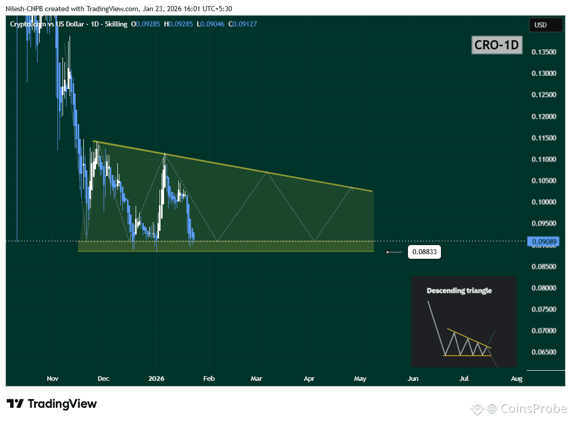 Price action shows CRO repeatedly making lower highs along a descending trendline, while buyers continue to defend a relatively flat support zone near $0.08833. This compression between sellers and buyers suggests that a decisive move may be building as volatility tightens.
