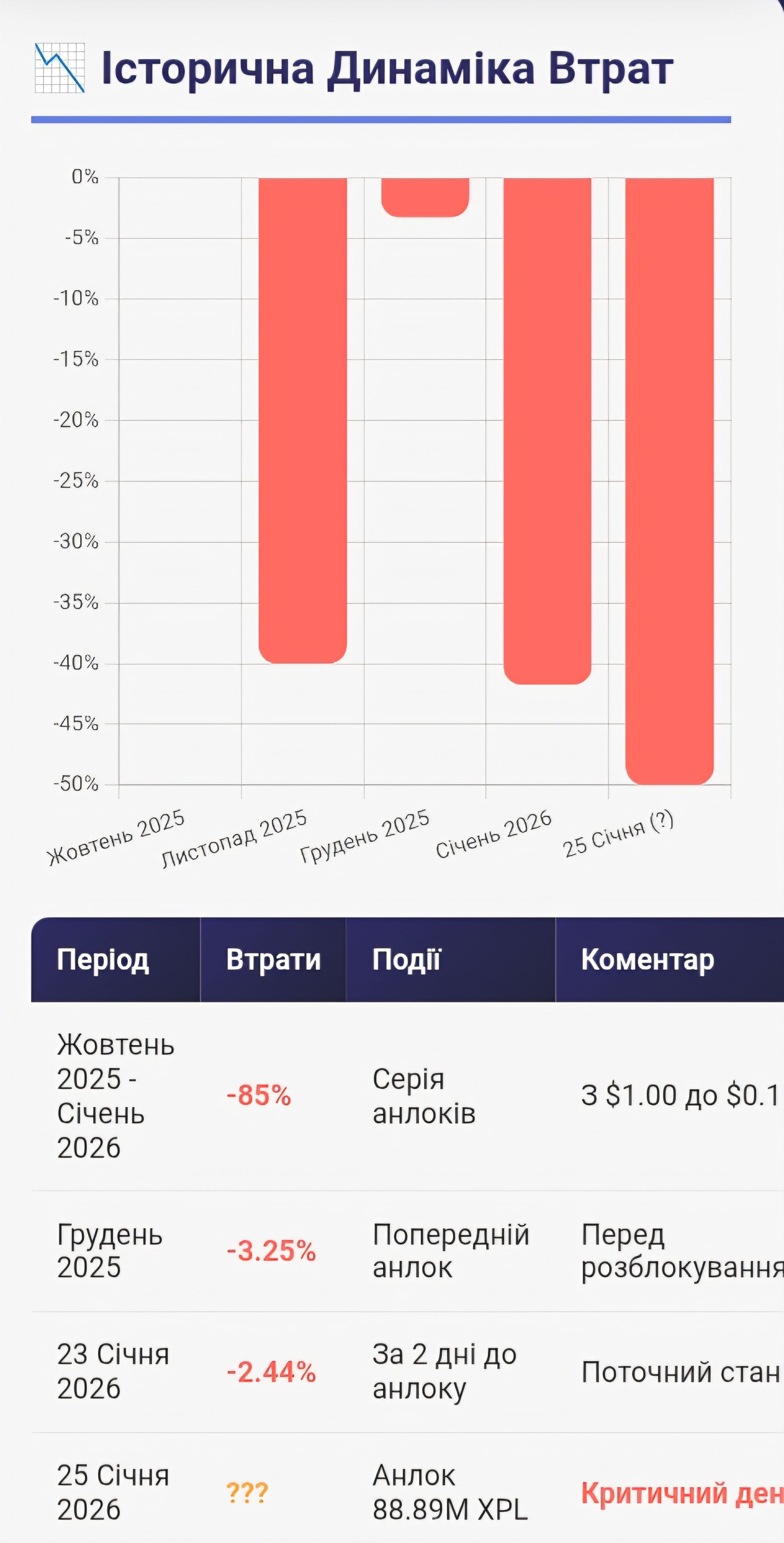 Післязавтра, 25 січня о 12:00 UTC, @undefined розблокує 88.89 мільйонів XPL токенів. Це 4.33% від усієї поточної пропозиції. За сьогоднішніми цінами – близько $13.8 мільйонів. Здається небагато? Подивіться на обсяг торгів – всього 9.08 мільйонів USDT за добу. Тобто за один день на ринок може вилитися майже в півтора рази більше токенів, ніж зараз торгується щоденно. Це як якби в магазині, де щодня продається 100 літрів молока, раптом на полиці з'явилося 150 літрів додатково. І всі роблять вигляд, що це нормально.