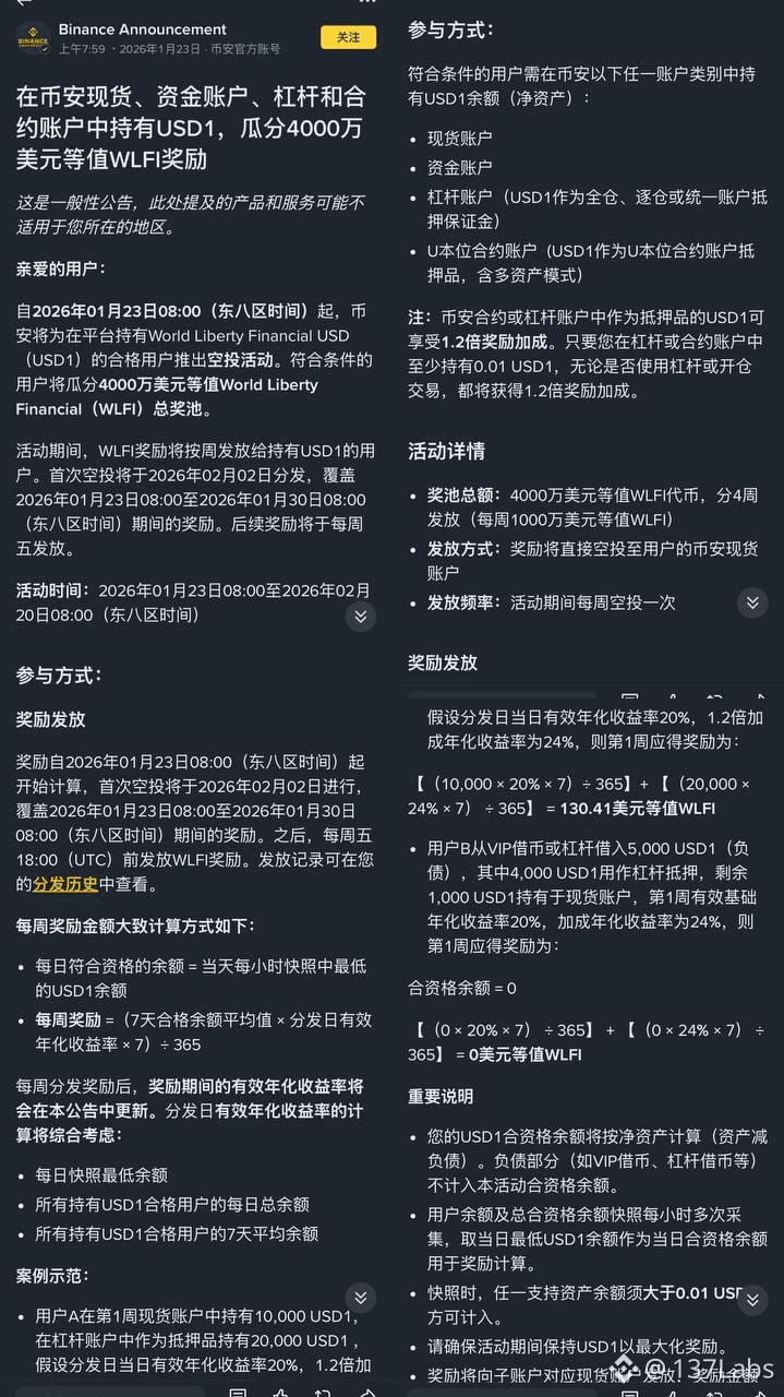 今日早间,Binance 宣布新一轮 USD1 持有奖励活动,从 2026 年 1 月 23 日 00:00 (UTC) 起,为期四周,总奖励池 4000 万美元 WLFI 代币。 每周分配 1000 万美元,用户只需在 Spot、Funding、Margin 或 Futures 账户持有 USD1 即可参与,无需额外操作。奖励基于平均持有余额快照计算,每周五空投至钱包。