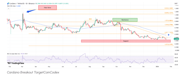 Яркое начало года было прервано, когда Cardano резко упал с $0.428 14 января до минимальных значений $0.342 пять дней спустя. Тем временем, монета стабилизировалась вокруг ключевой поддержки в средних $0.30, как подчеркнул анализ TradingView от CoinCodex.