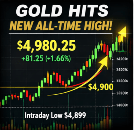 Золото $XAU вскочило до нового исторического максимума в пятницу, восстановив сильный бычий импульс после кратковременного отката ранее в сессии. Цены резко отскочили от внутридневного минимума около $4,899, торгуясь около $4,980 на момент написания и отметив третью подряд недельную прибыль.