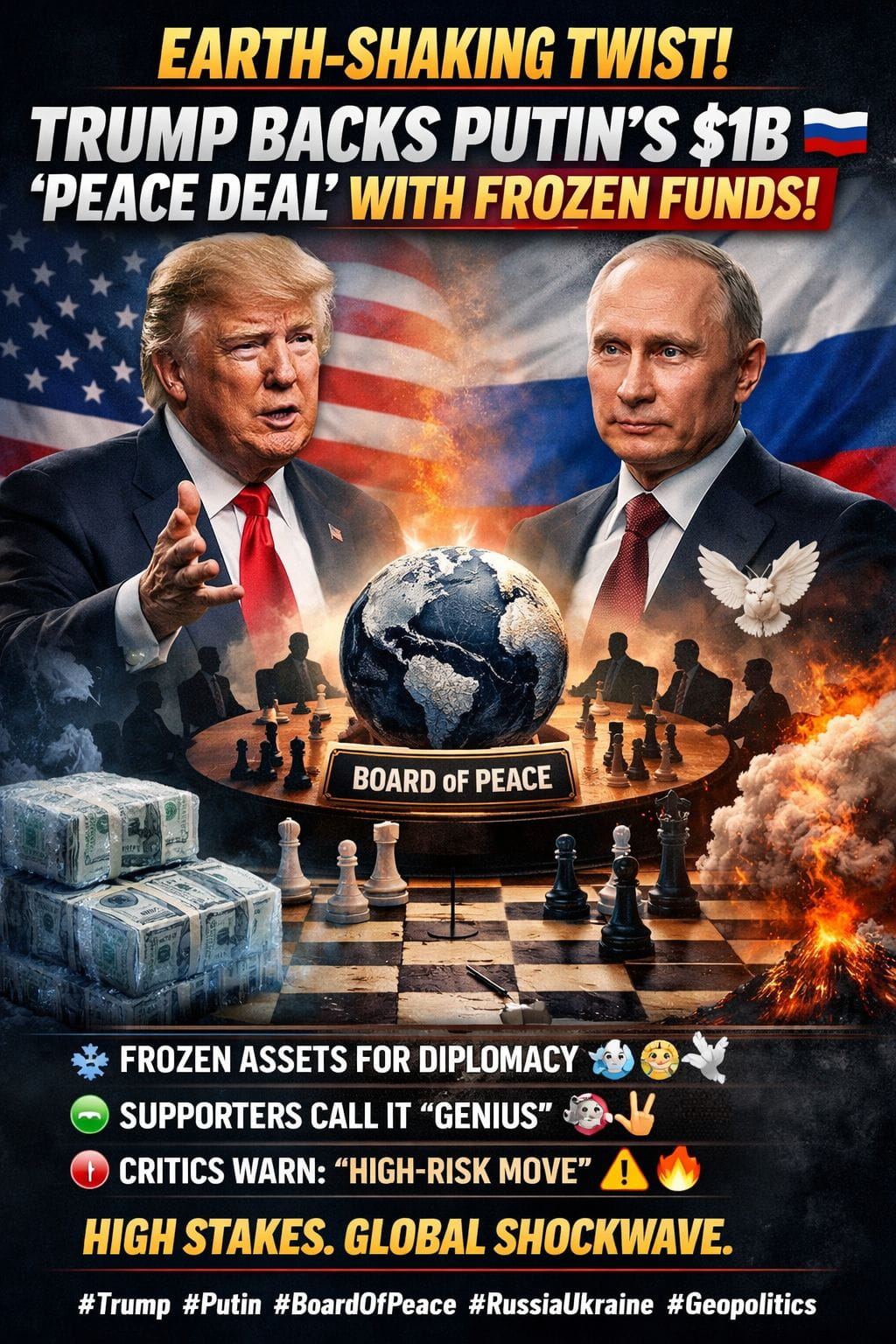 JUST IN — In a move shaking global capitals and financial markets 🌍📉, President Donald Trump has signaled openness to Russian President Vladimir Putin using $1 BILLION from frozen Russian assets to participate in Trump’s bold new initiative: the “Board of Peace.” 🕊️♟️