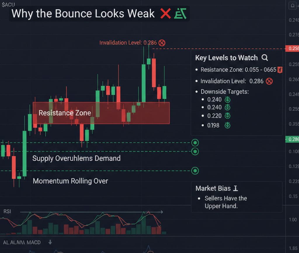 $ACU recently attempted a bounce, but the move ran straight into a heavy supply zone, where sellers quickly stepped in. While price did push higher initially, it failed to gain acceptance above resistance, signaling that upside momentum is starting to fade.