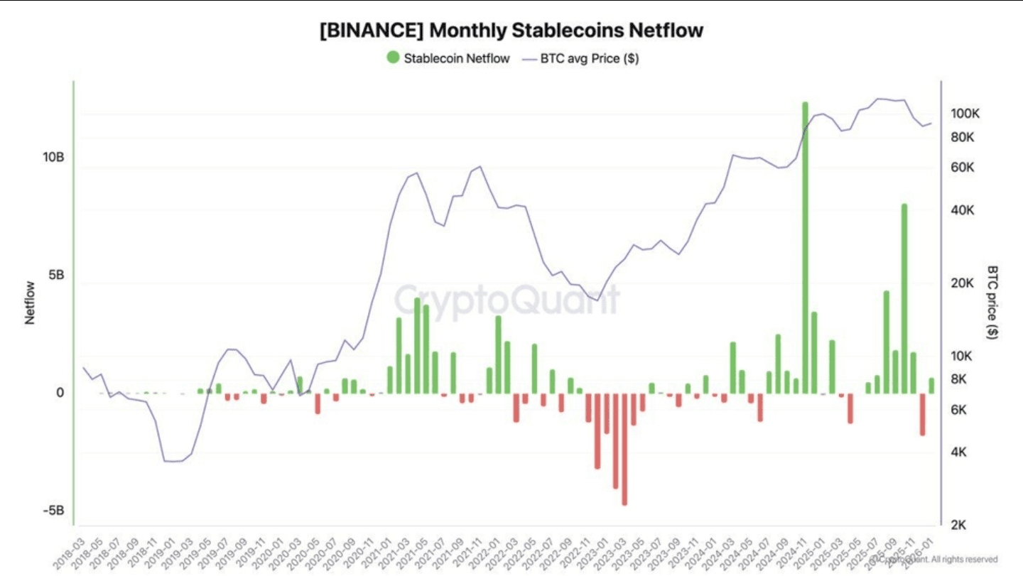 Стоит отметить, что прошлый октябрь был исключительным с точки зрения потоков; тогда Binance зафиксировала огромные чистые потоки более 8 миллиардов долларов США благодаря привлекательным возможностям покупки после ценовых коррекций. Затем последовал период относительного затишья в ноябре (~1,7 миллиарда чистого потока), прежде чем ситуация изменилась на отток ликвидности в декабре, как мы уже упоминали. А возвращение крупных потоков в январе является первым признаком того, что ожидаемые капиталовложения начали вновь перераспределяться, готовясь к новому туру активной торговли цифровыми активами. И несмотря на то что эта втекающая ликвидность увеличивает огневую мощь рынка, остается вопрос: будет ли это сразу переведено в ценовые повышения или это просто тактическая подготовка в ожидании подходящих условий? Текущие индикаторы (такие как рост соотношения BTC/Stablecoins и стабильность цены биткойна, несмотря на вливание) указывают на то, что мы находимся на этапе создания новых позиций, больше чем на слепом порыве.