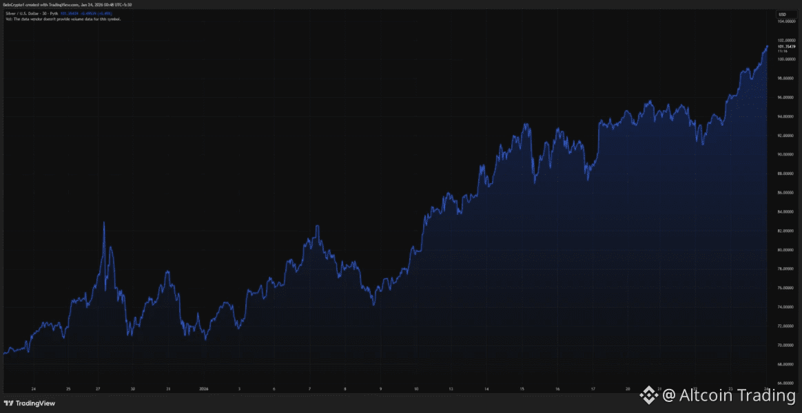 $BTC , однако, пока не повторил такую динамику. Это расхождение выводит на главный вопрос для крипторынка: что прорыв серебра может означать для будущего биткоина?