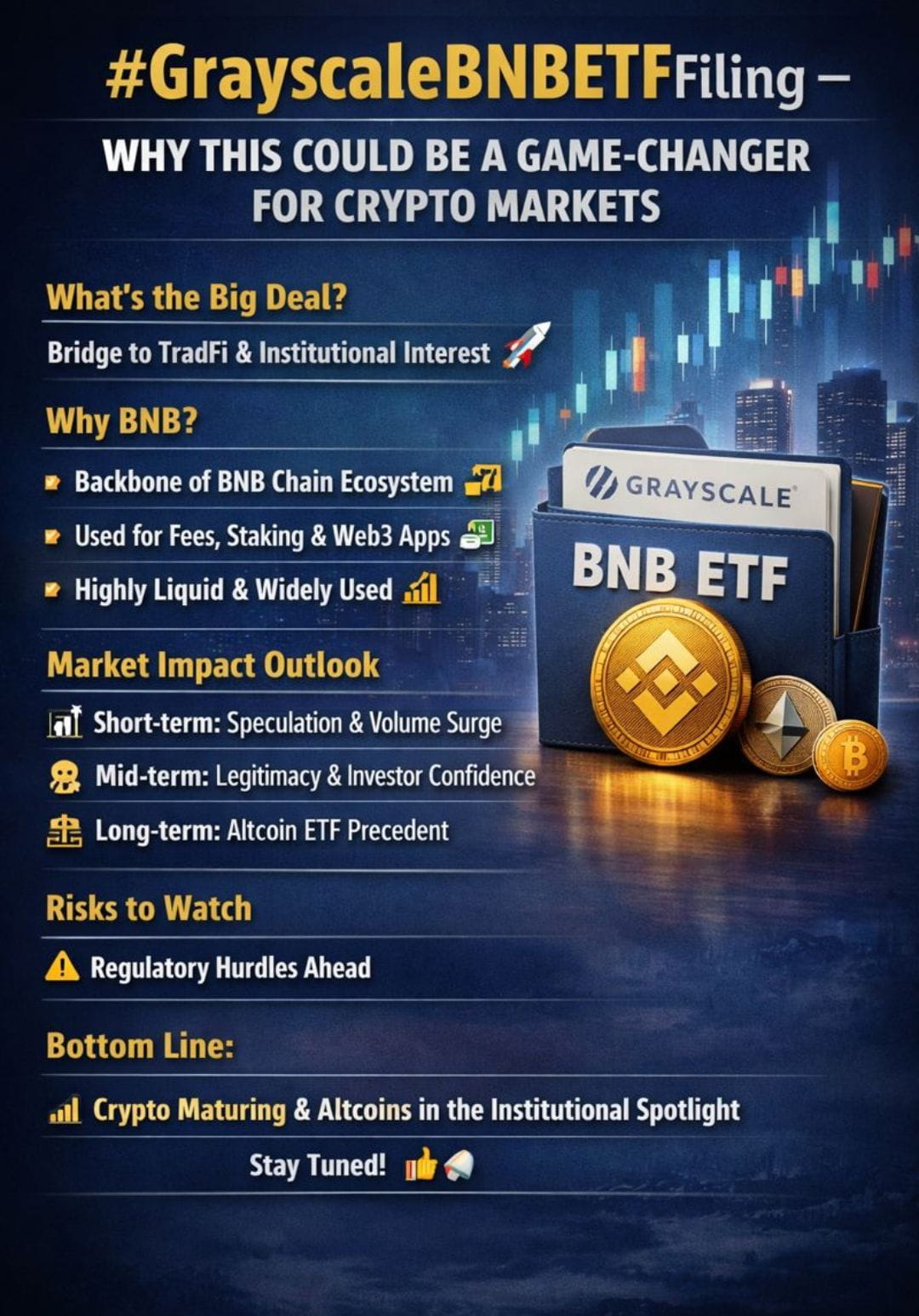 Grayscale has long been a bridge between traditional finance (TradFi) and crypto. An ETF linked to BNB would potentially open the door for institutional and regulated capital to gain exposure without directly holding the asset. That’s a big psychological and structural shift.