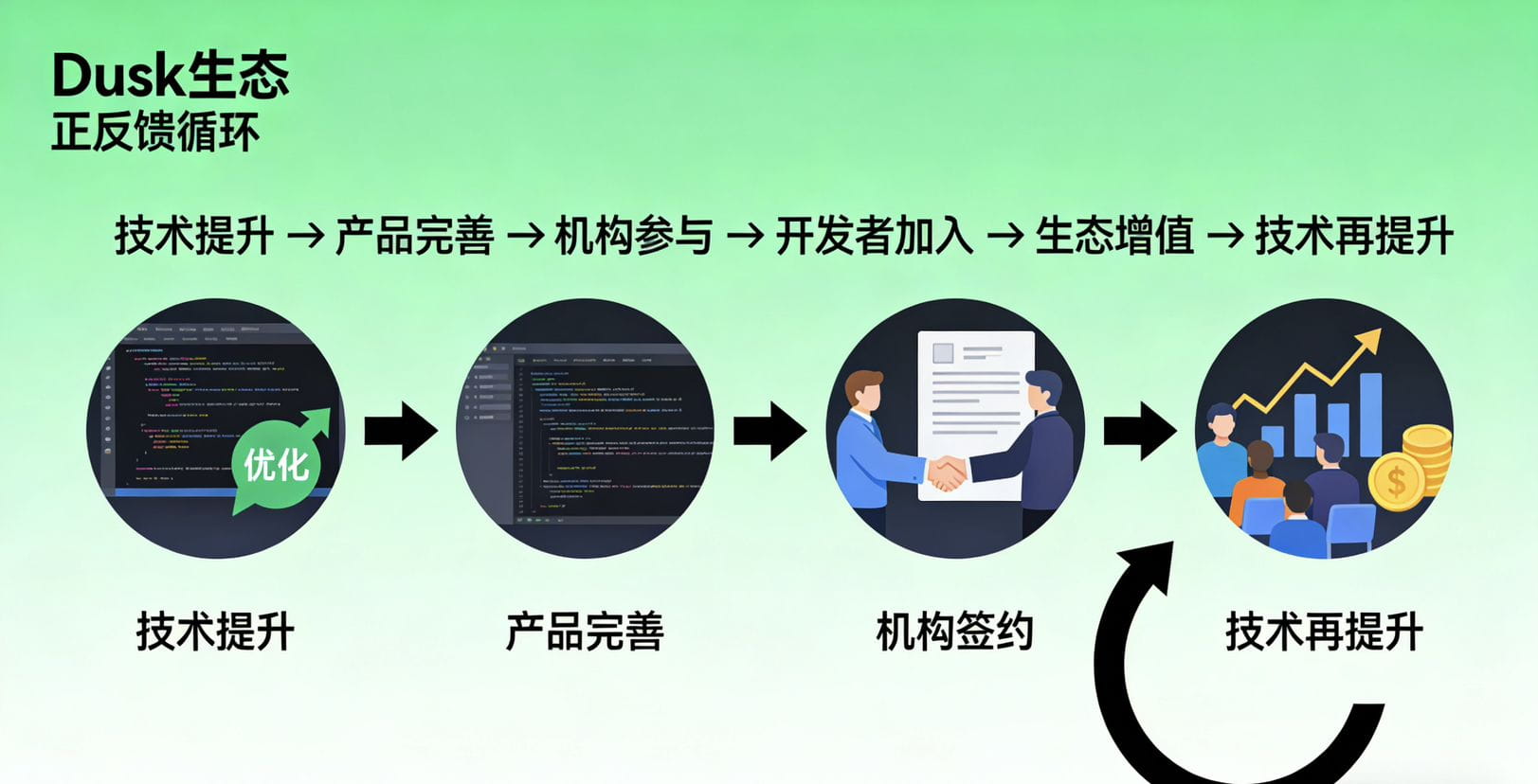 传统RWA的生态布局,各个环节之间相互割裂,无法形成协同效应,而在Dusk的生态中,技术底层、核心产品、机构合作、开发者生态之间形成了强协同效应,打造了生态的正反馈循环: