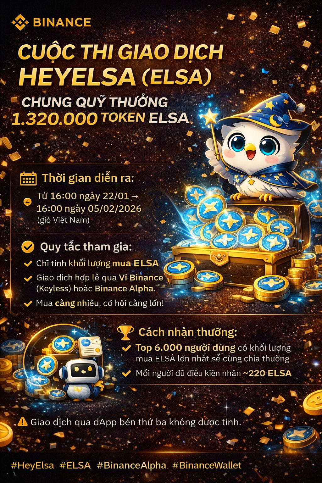 Binance đang tổ chức cuộc thi giao dịch HeyElsa (ELSA) dành cho người dùng Ví Binance (Keyless) và Binance Alpha. Trong thời gian sự kiện, bạn có thể giao dịch mua ELSA và nhận phần thưởng token miễn phí nếu đạt thứ hạng cao.