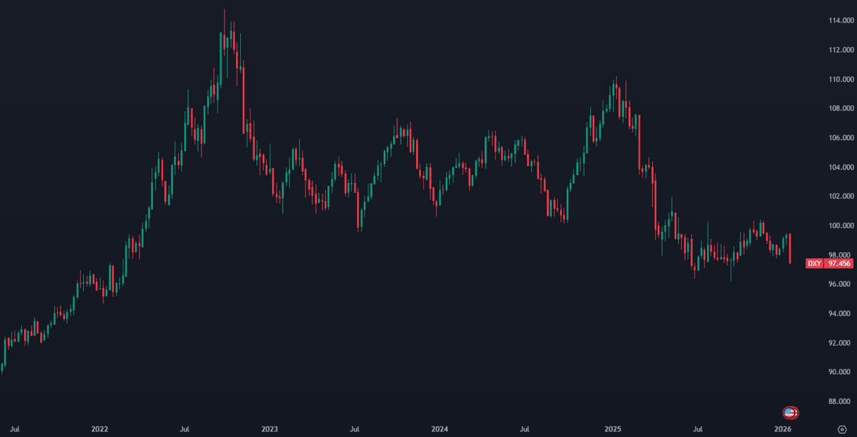Индекс доллара США DXY только что зафиксировал крупнейшее недельное падение с апреля 2025 года, упав почти до уровня 98.5. Графики показали явное пробитие его недавнего диапазона, что является признаком снижения силы доллара. Рынки сейчас отражают снижение доверия к международным денежным потокам.