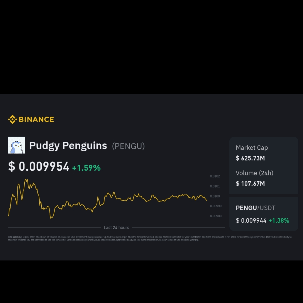 📍 Цена (сегодня, примерно): $0.0099–$0.0100 USD за токен PENGU — примерно стабильно за последние 24 часа и показывающая некоторую незначительную волатильность. �