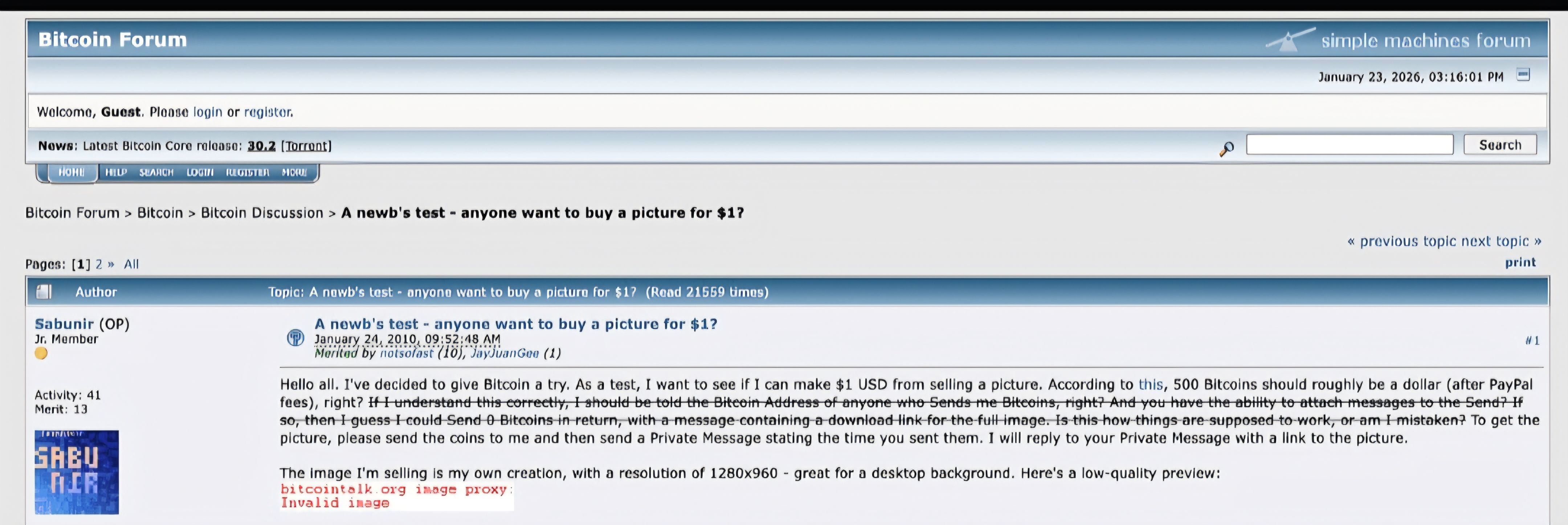 In the earliest days of Bitcoin, no one knew what was coming — not even the pioneers. On January 24, 2010, a Bitcointalk user named Sabunir casually tested the network by trying to sell a simple digital picture for 500 BTC. At the time, that sounded reasonable — roughly $1 in value.