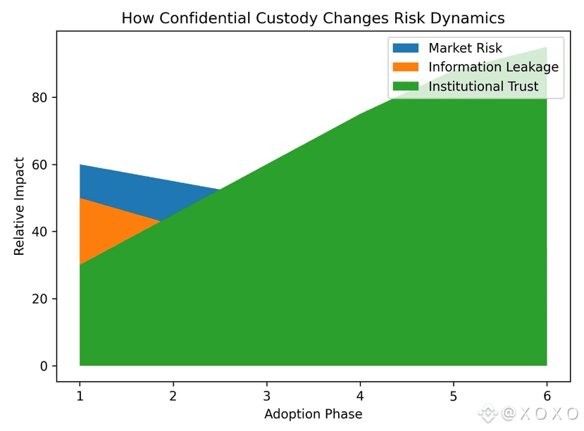 From a risk perspective, this balance reduces multiple failure modes at once. Market risk decreases because positions are not visible. Operational risk decreases because systems do not rely on constant obfuscation. Legal risk decreases because data exposure is minimized. Reputational risk decreases because custody arrangements look professional rather than experimental.