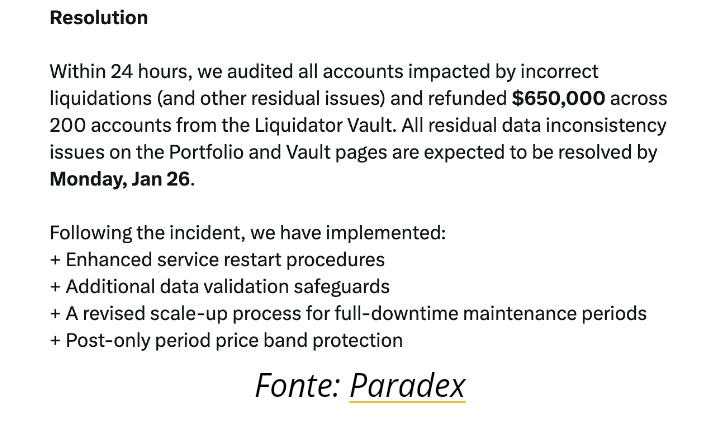 После этого Paradex сообщила, что внесла изменения в процессы, чтобы избежать повторения проблем. Теперь есть лучше организованный перезапуск, дополнительная проверка данных, пересмотр схемы обслуживания (с полной остановкой, но запланированной) и даже защита ценового диапазона, действующая только после открытия рынка.
