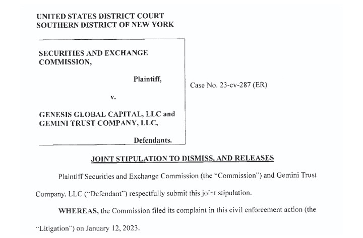 Согласно документам суда, две компании и SEC согласовали вместе попросить о прекращении процесса в пятницу, там, в Южном окружном суде Нью-Йорка. На практике это закрывает жалобу SEC на схему кредитования криптовалюты Gemini с Genesis.