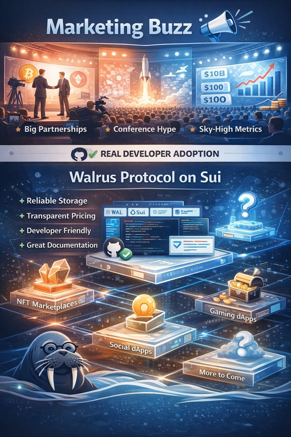 Є цікавий феномен у технологічній індустрії: те, про що найгучніше кричать на конференціях, рідко стає тим, що реально використовують у production. Маркетологи люблять гучні анонси, partnerships з великими брендами, кричущі цифри про TPS та капіталізацію. А розробники тим часом сидять у своїх IDE, вибирають інструменти на основі документації, простоти інтеграції, реальної вартості та надійності. @Walrus 🦭/acc стає тим вибором, про який не пишуть у Forbes, але який з'являється все частіше в GitHub repositories проектів на Sui. Це тихе голосування найбільш критичної аудиторії – тих, хто насправді будує.