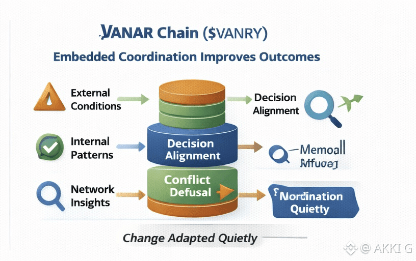Vanar’s design suggests that coordination is not something you bolt on later. It is something you design into the base layer. When memory is persistent and AI agents can interpret historical context, coordination stops being reactive. The system does not wait for failures before adjusting. It anticipates patterns, nudges behavior, and smooths interactions before friction turns into damage.