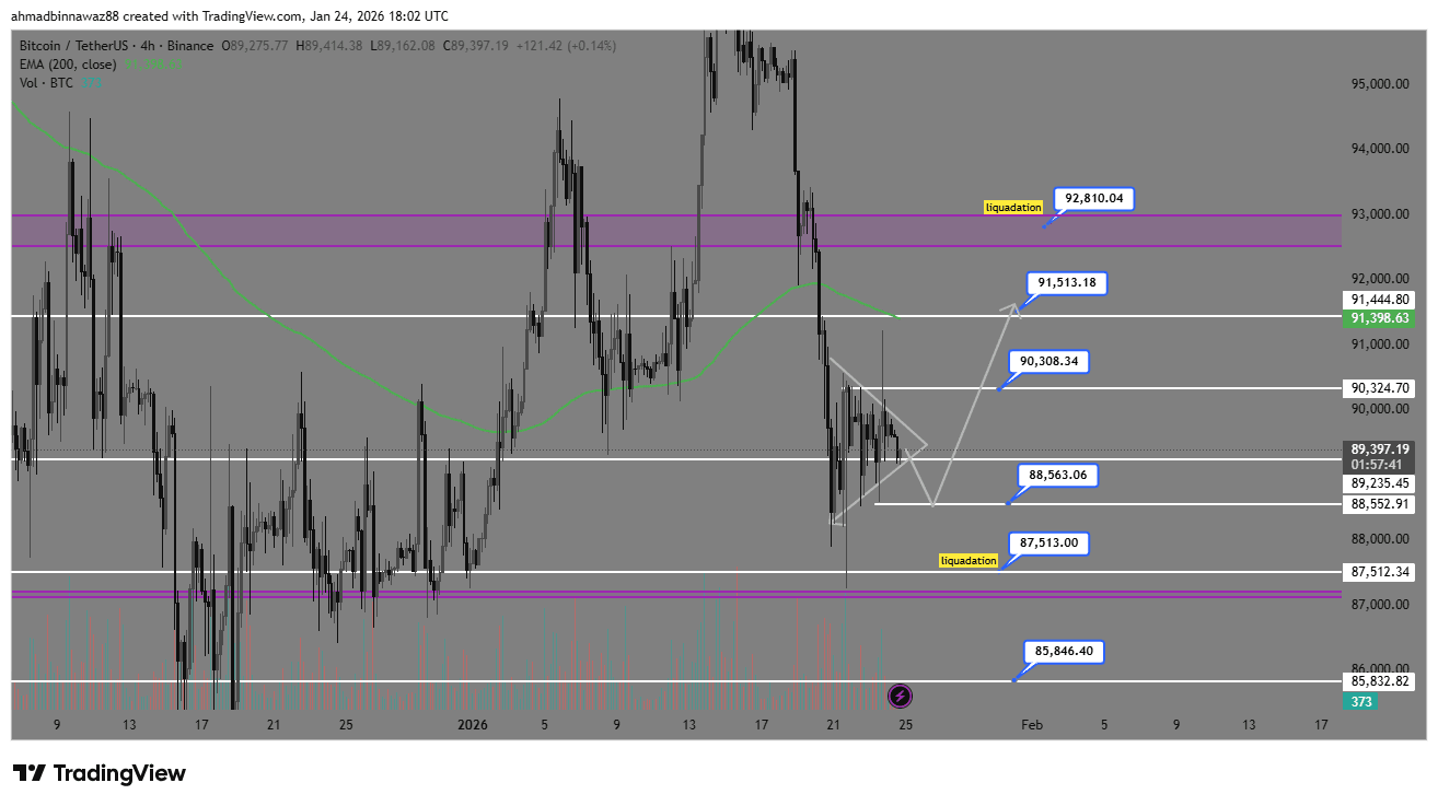 $BTC Биткойн сформировал медвежью модель «арахис». В то же время уровни ликвидации BTC находятся около 87,500 и 88,500.