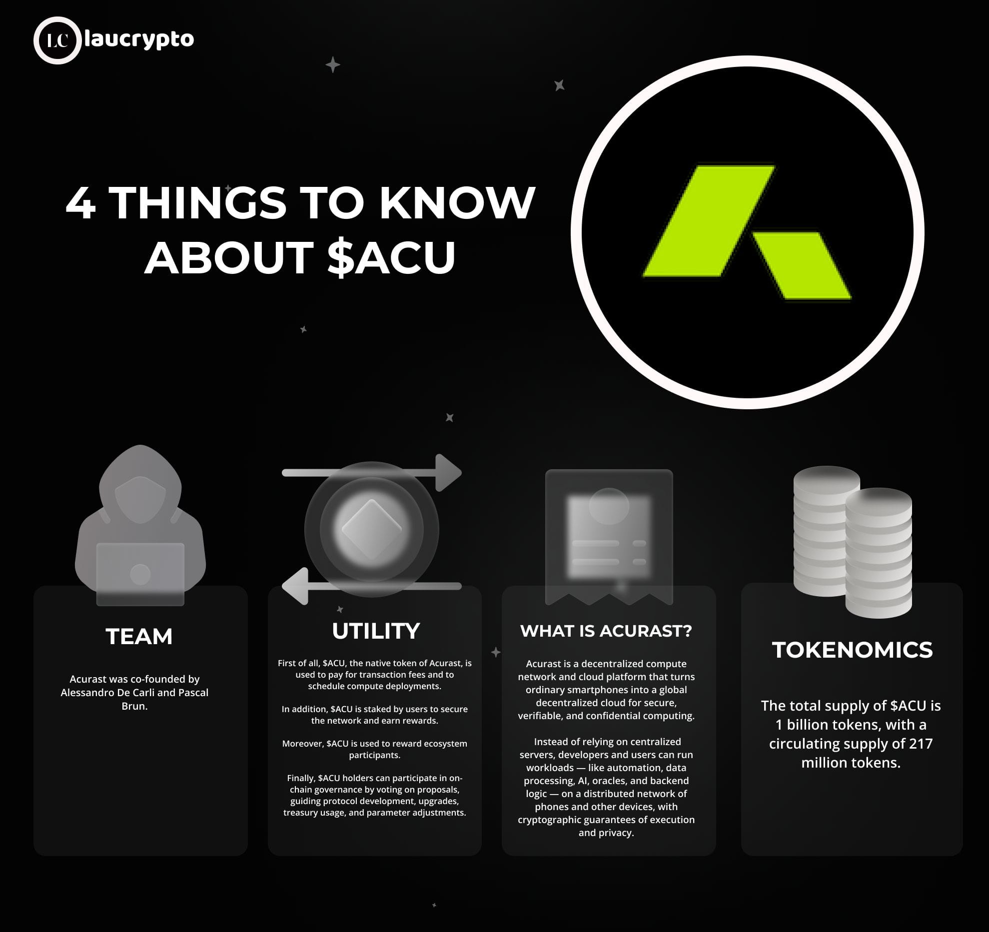 $ACU é o token nativo do Acurast, uma rede de computação descentralizada e plataforma em nuvem que transforma smartphones comuns em uma nuvem descentralizada global para computação segura, verificável e confidencial.