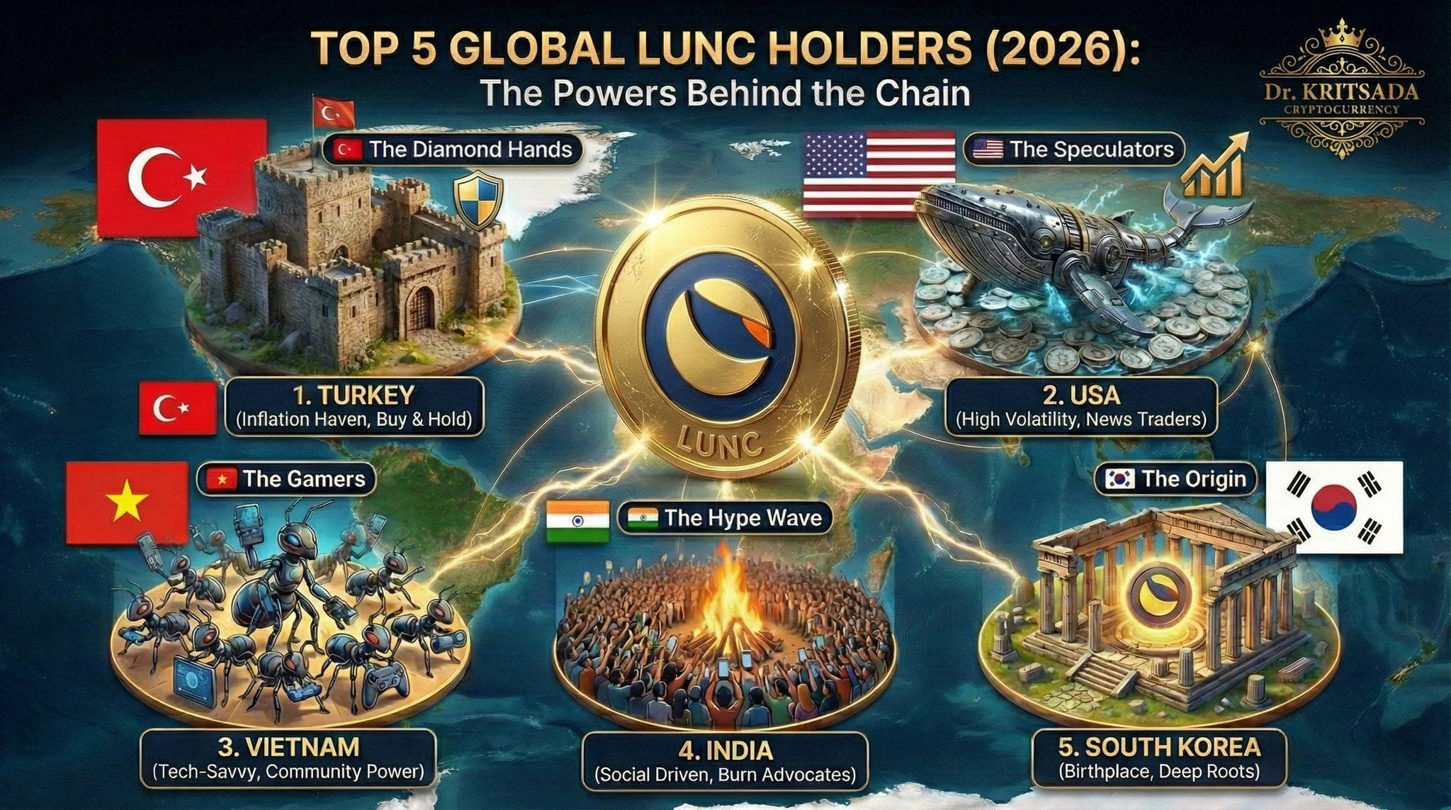 Вьетнам обеспечил себе место в тройке лидеров с мощной армией розничных инвесторов. Известные своей быстрой адаптацией, вьетнамские инвесторы (владеющие примерно 8–10%) являются основой "LUNC Army" в социальных сетях. Их способность организовывать и поддерживать инициативы по сжиганию, возглавляемые сообществом, является важным двигателем дефляционных целей экосистемы.
